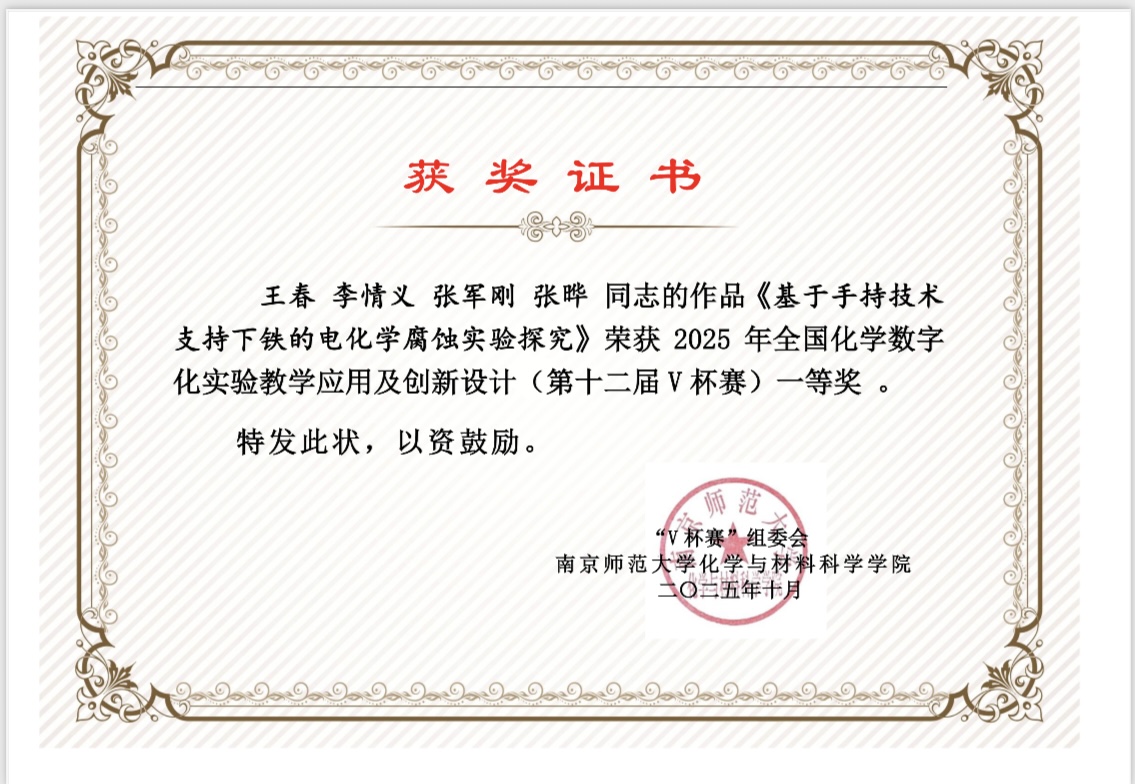 学院数学与科学教育学院化学系王春教授带队,一行4人,以《基于手持技术支持下铁的电化学腐蚀实验探究》项目获得比赛一等奖,充分展现我院在化学数字化实验教学领域的研究实力与创新水平。比赛中,参赛团队紧密围绕高中化学教学中的重点与难点—铁的电化学腐蚀展开,创新引入手持技术搭建数字化实验体系。该项目通过实时数据采集与可视化呈现,清晰揭示了铁在不同环境下的腐蚀过程复杂反应机理,有效破解了传统实验“现象不明显、数据难量化”的教学痛点。在成果展示交流中,王春教授详细阐述了项目设计思路、研究思考过程及应用效果,其严谨的研究逻辑、创新的技术融合方式,获得了评委与参会同行的高度认可。