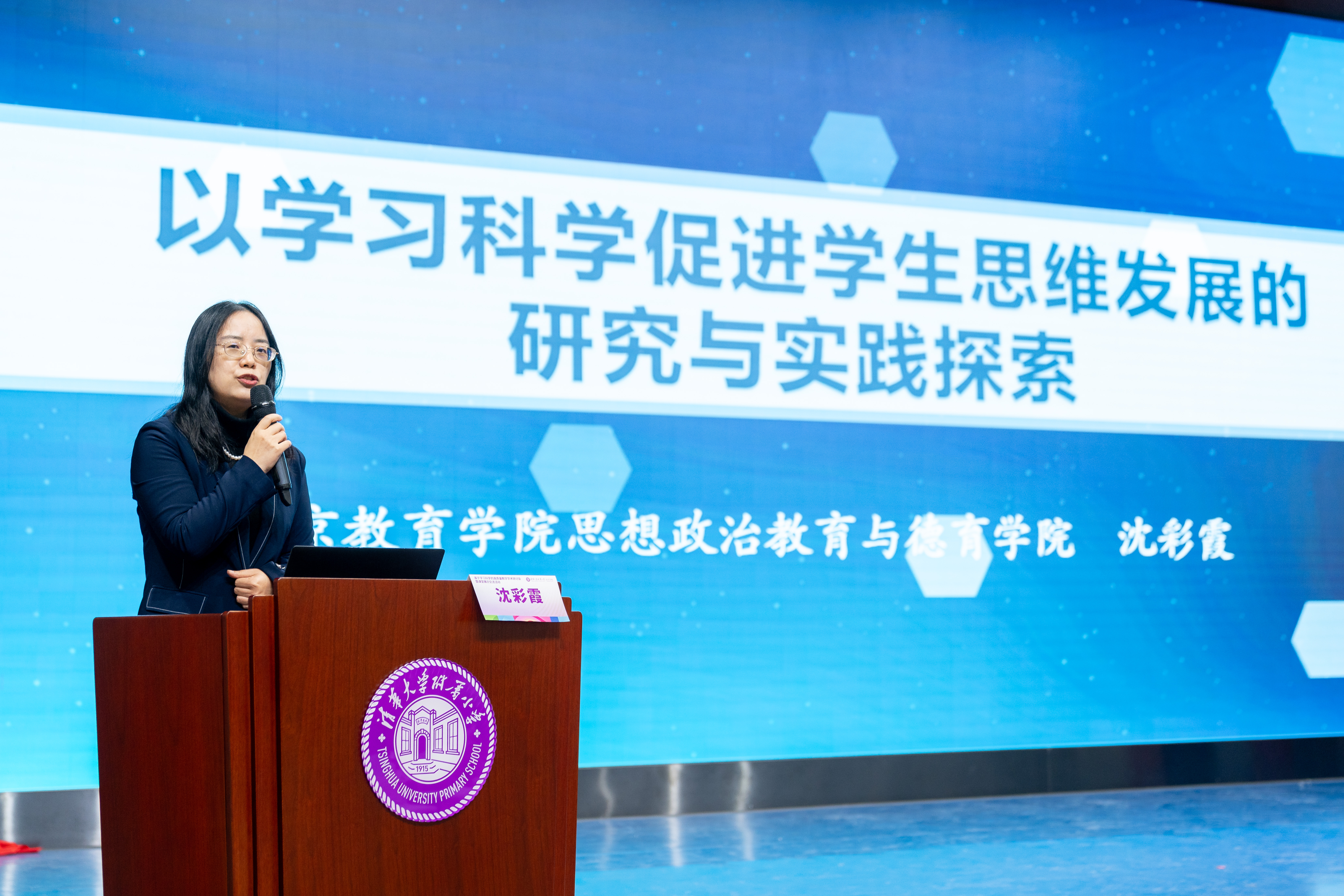 在主题发言环节,清华大学附属小学昌平学校党总支书记刘建伟致欢迎辞。北京教育学院“基于学习科学的高质量教学研究”创新平台负责人、思想政治教育与德育学院副院长沈彩霞以“以学习科学促进学生思维发展的研究与实践”为题,分享了研究成果。据介绍,“基于学习科学的高质量教学研究”创新平台关注学生思维品质提升,探讨学习机制。基于脑科学,团队提出“具身-建构-反思-评价”四位一体的通用教学模式,指向思维品质的提升,并通过13所基地校,致力于把学习科学的研究发现与课堂教学深度融合。