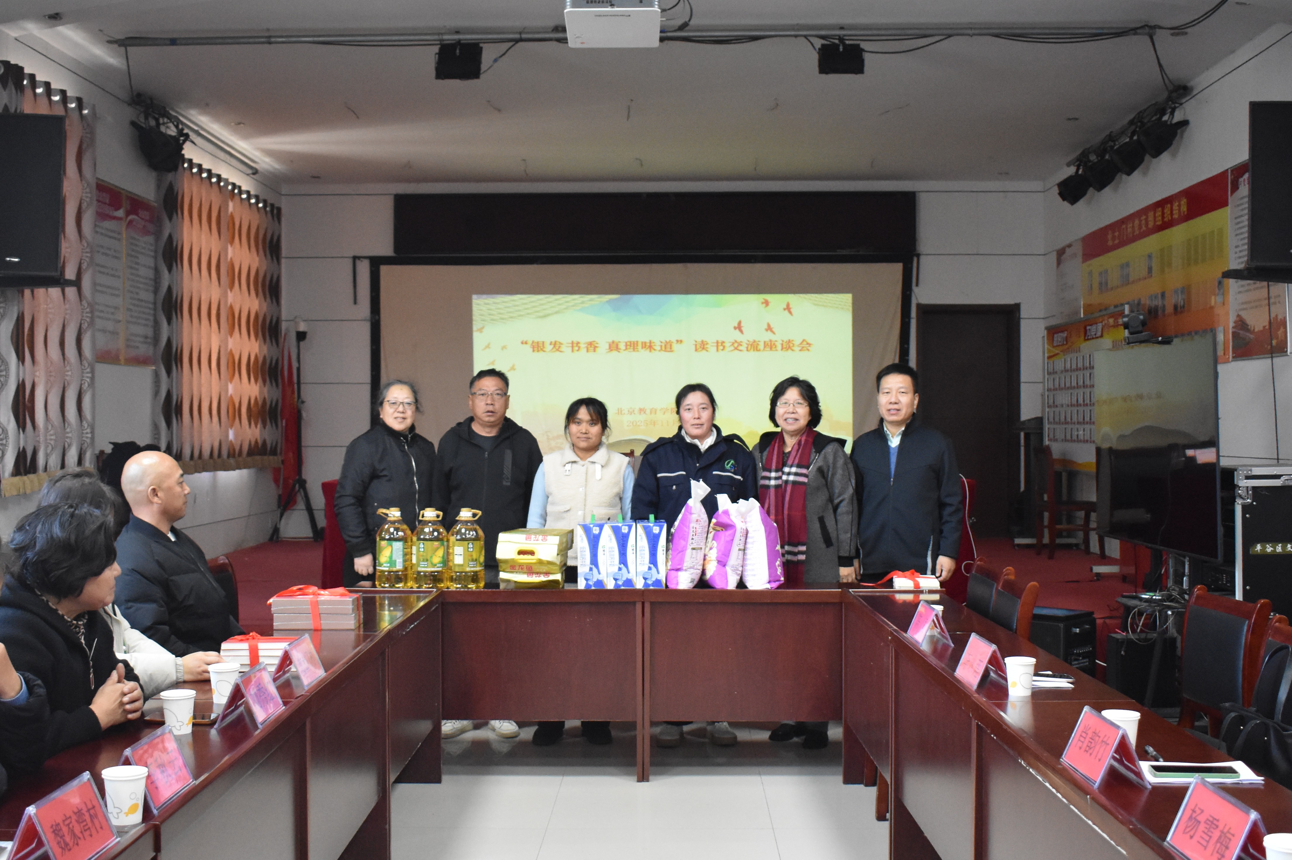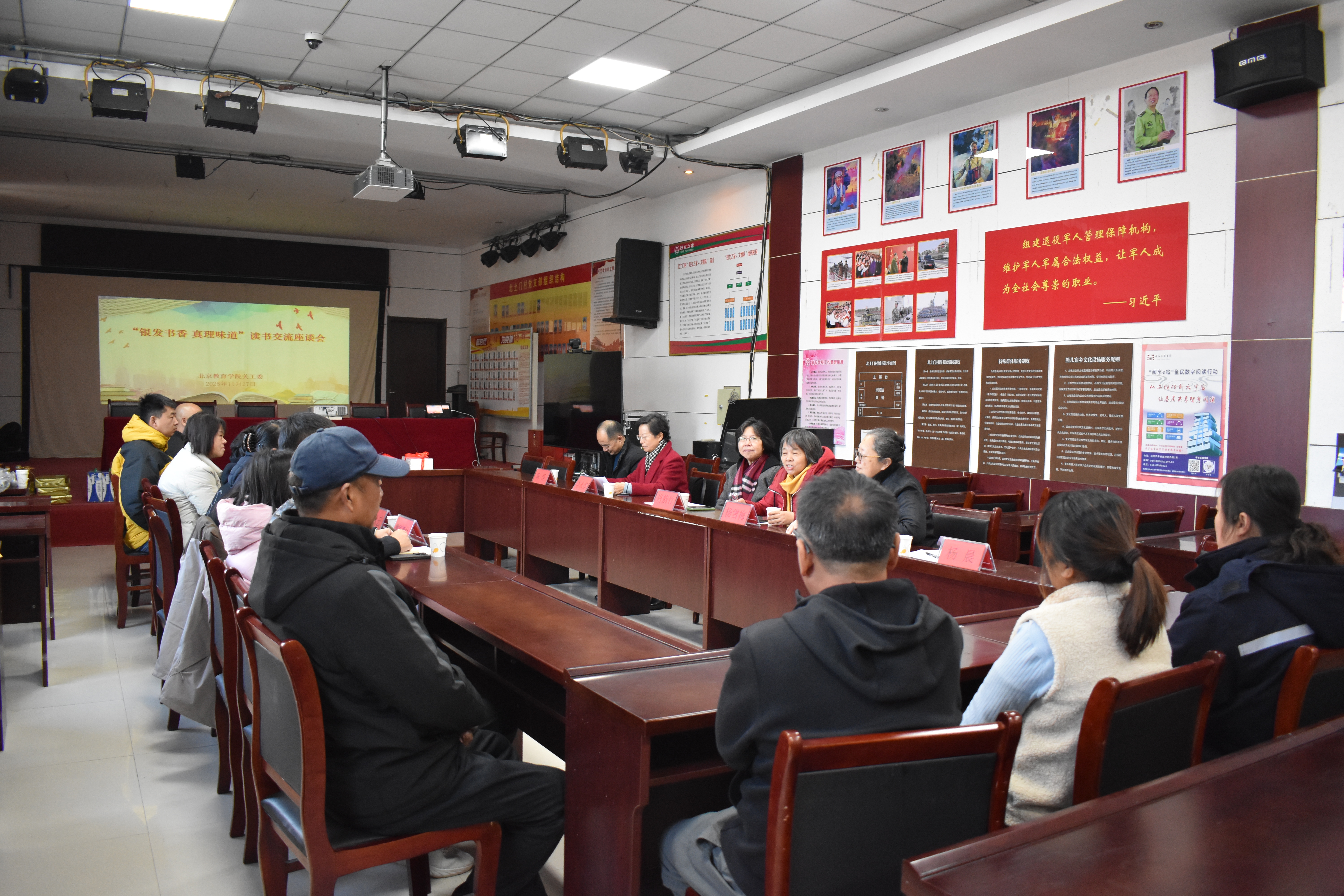 11月27日,我院关工委在平谷区熊儿寨乡北土门村召开“银发书香·真理味道”红色读书座谈会,共同打造“红乡映翠”读书推广计划。学院关工委主任肖韵竹出席活动并讲话,关工委秘书处处长李凌、关工委委员代表杨雪梅教授、老教协会员代表李永莲老师、熊儿寨乡北土门村党支部书记刘秀红、魏家湾村村委会主任李秋云、驻村第一书记侯德岳、两个村的“两委”委员、村民代表、网格员、北土门红色诵读队代表共20余人参加活动。会议由李凌主持。