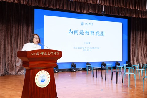 在优秀论文分享环节,人文与外语教育学院教育戏剧研究中心王秀荣老师以“为何是教育戏剧”为题分享,强调教育戏剧的核心是育人而非“演戏”,它作为一种注重“做中学”与“情境体验”的教学方法,是实现“全人教育”的重要途径,能有效推动课堂教学从知识传递转向素养培育,有助于打破学科壁垒,真正落实“五育并举”。北京师范大学三帆中学朝阳学校朱晓旭老师、北京市西城区第十五中学刘梦颖老师分别分享了教育戏剧在初中语文整本书阅读和社会情感能力培养方面的研究成果与教学策略。