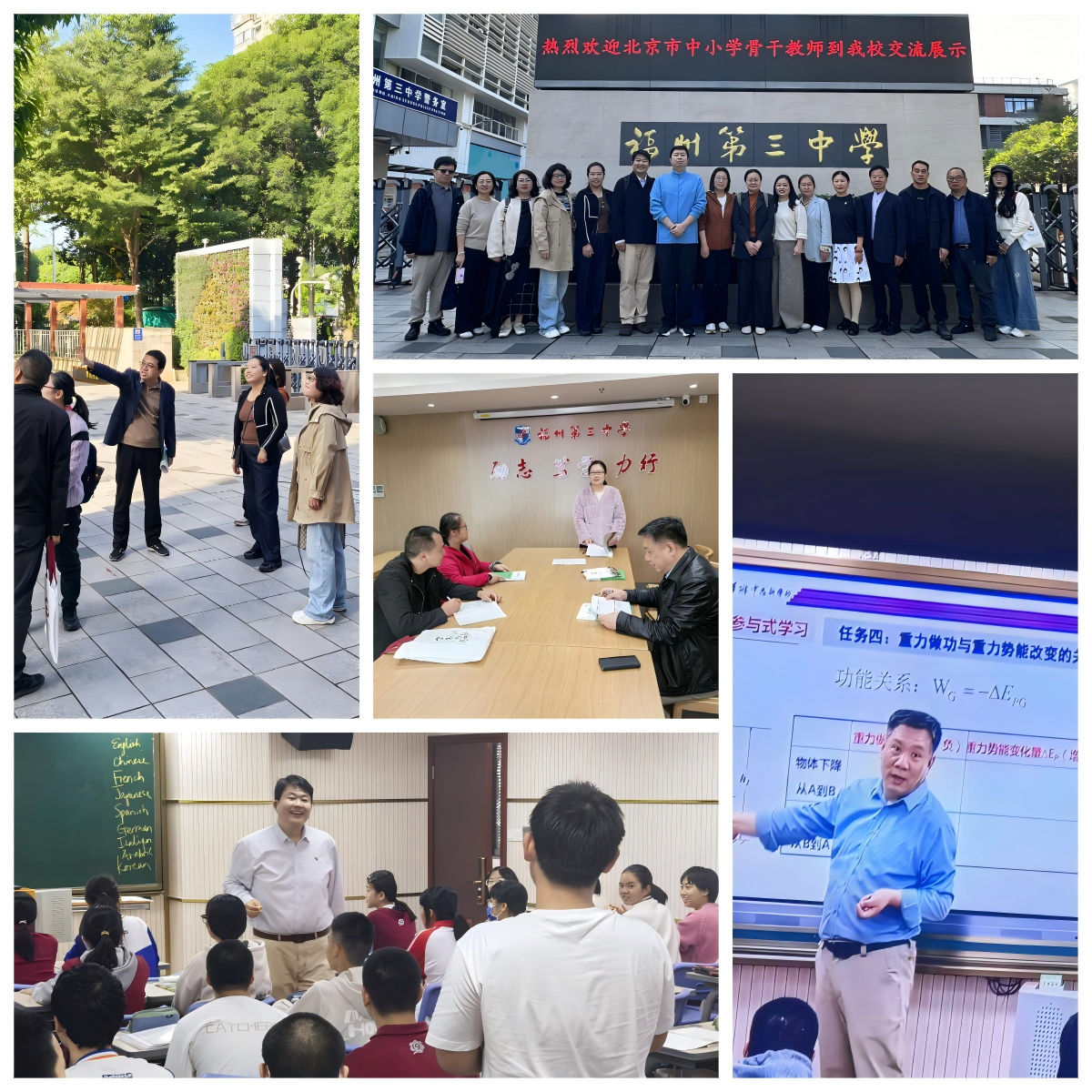 在福州第三中学,清华附中志新学校张利民老师上高中物理示范课《从路径无关到系统共有——重力势能的研究》,快速搭建生活与物理的桥梁,引发学生对生活中物理现象的思考;北京二中焦世强老师上高一英语示范课《Unit 5 听说课Explore languages around the world》,通过课堂即时对话与写作活动,探索语言技能与学科育人目标深度融合。