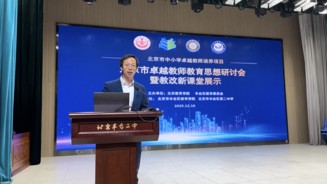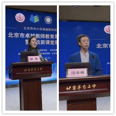 12月10日,由北京教育学院、丰台区教育委员会主办,丰台区教育学院、北京市丰台区第二中学承办的“北京市卓越教师教育思想研讨会暨教改新课堂展示”(丰台场)活动在京顺利举行。北京教育学院党委常委、副院长庞成立,北京市教师发展中心主任鲜万标,北京教育学院教务处处长、教授张金秀,丰台区教委副主任曲兆军,北京教育学院教授、北京市特级教师协会会长汤丰林,丰台区教育学院书记焦素琴,北京师范大学教育研究所教授胡艳等出席活动。首都教育界的专家、学者及一线教师近200人参会。活动由北京教育学院人文与外语教育学院副教授胡春梅主持。