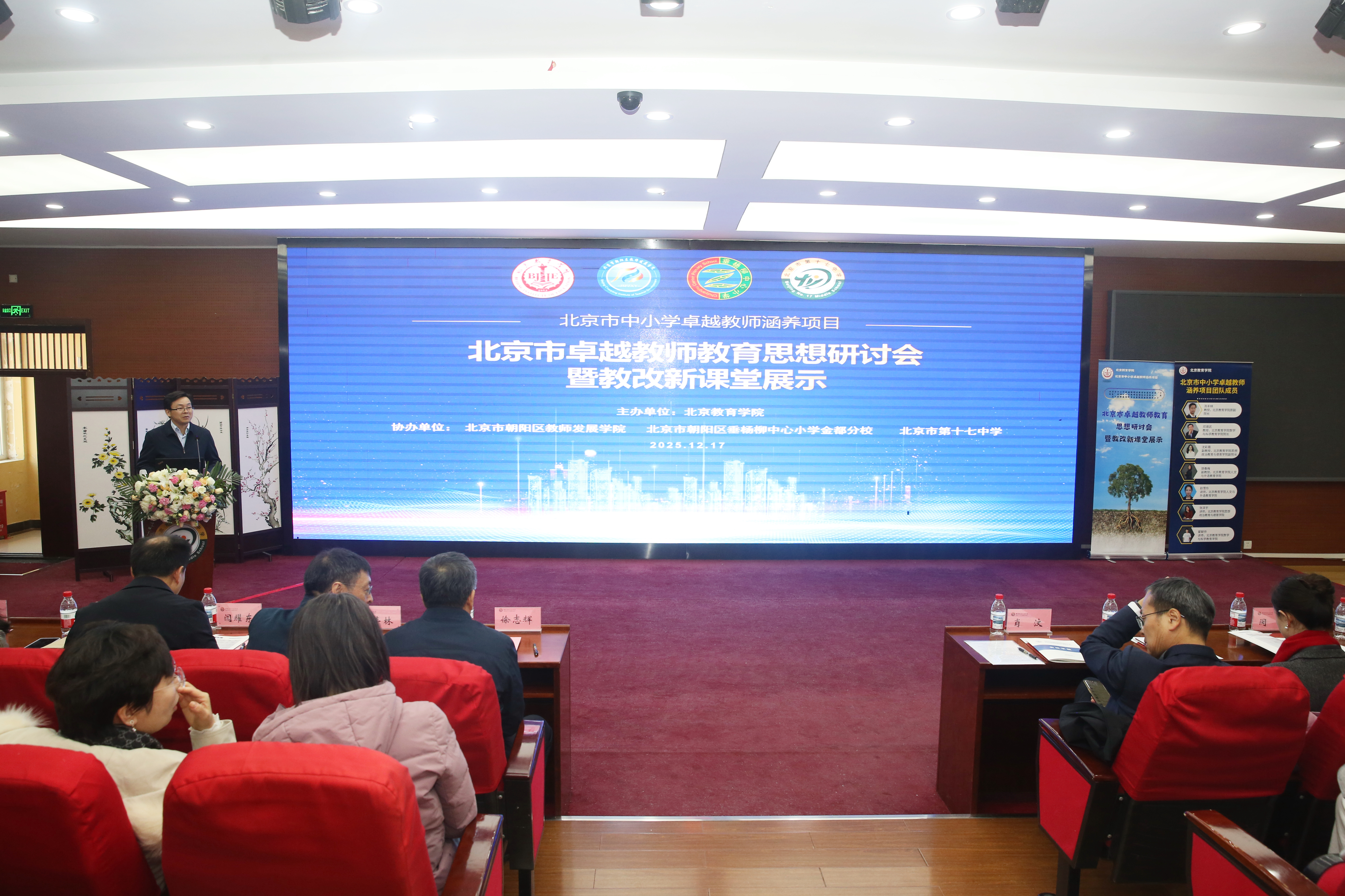12月17日,由北京教育学院、朝阳区教育委员会主办,北京市朝阳区教师发展学院、北京市第十七中学、北京市朝阳区垂杨柳中心小学金都分校承办的“北京市卓越教师教育思想研讨会暨教改新课堂展示”(朝阳场)活动在京顺利举行。北京教育学院党委常委、副院长肖汶,朝阳区教委主任徐志辉,北京教育学院教授、北京市特级教师协会会长汤丰林,北京师范大学教育学部副部长、教授滕珺,朝阳区教委副主任闵慧、朝阳区教师发展学院院长谢鹃等出席活动。活动由北京教育学院数学与科学教育学院院长邓靖武教授主持。首都教育界的专家、学者及一线教师近300人参会。