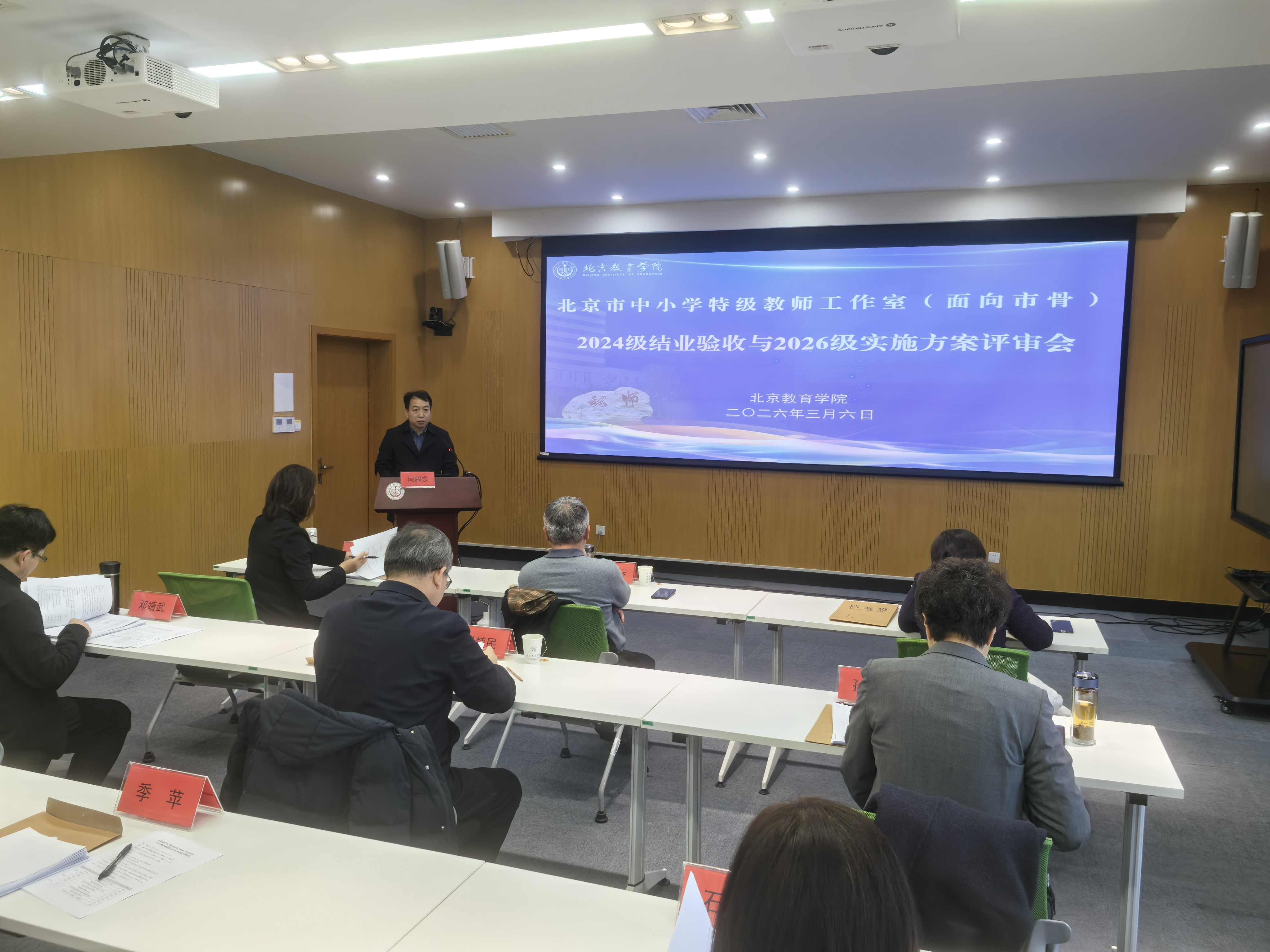 3月6日,北京市中小学特级教师工作室(面向市骨)2024级结业验收与2026级实施方案评审工作在北京教育学院黄寺校区顺利举行。本次评审工作打破验收与评审分阶段推进的传统形式,将两项工作统筹整合、同步开展,旨在以评促建、以审领航,实现工作室建设成果梳理与未来发展规划的无缝衔接,为市级骨干教师培训工作提质增效。会议邀请了北京市教师发展中心、海淀区教师进修学校、东城区教育科学研究院、西城区教育研修学院、一线名校教研与管理岗位老师及学院领域专家组成评审团队。会议由教务处副处长闫耀东主持。
