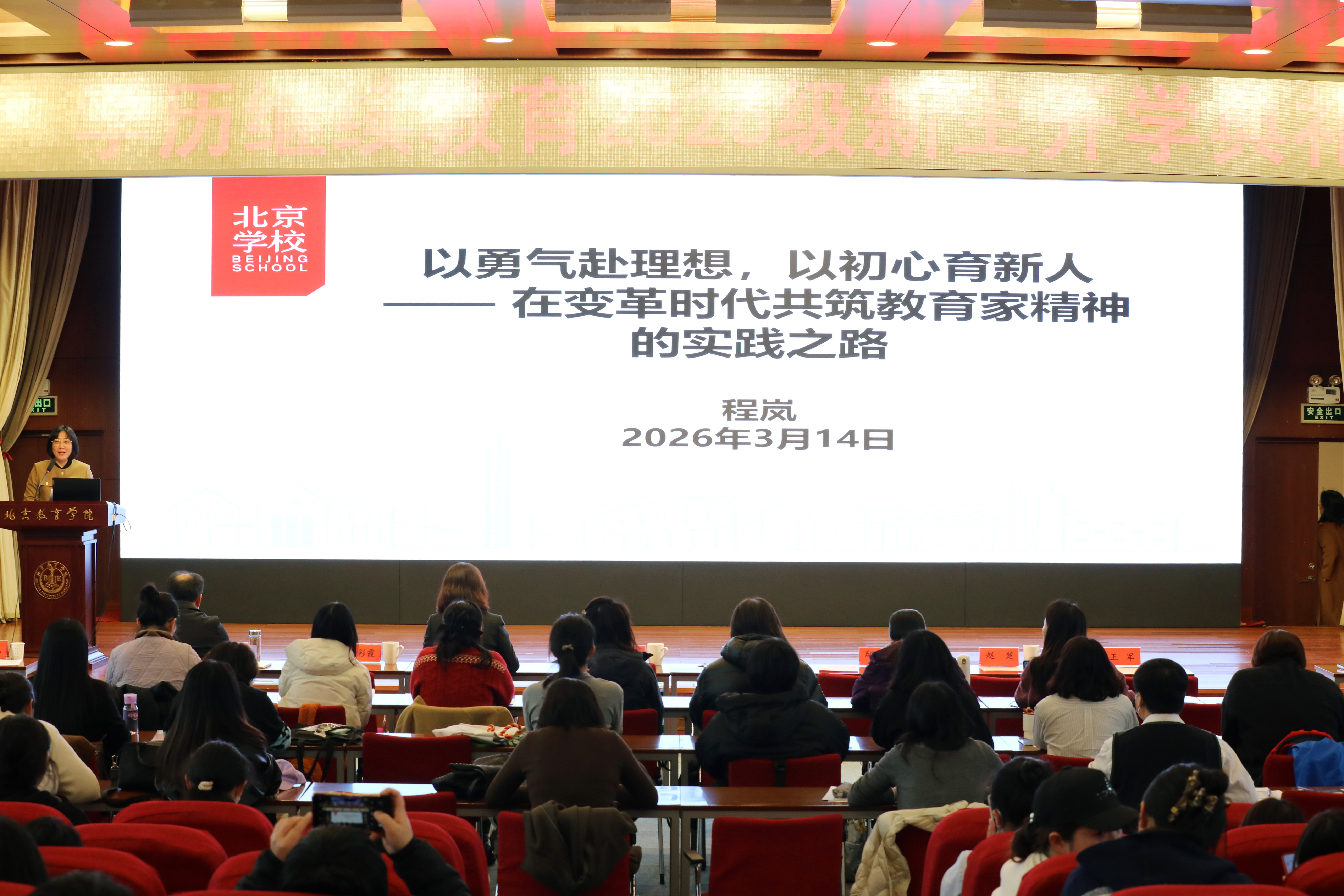 典礼后,北京学校副校长、特级教师、正高级教师程岚以《以勇气赴理想,以初心育新人——在变革时代共筑教育家精神的实践之路》为题,为全体新生讲授开学第一课。程岚校长结合自身丰富的一线教育实践,围绕“播下‘种子’、炼功筑‘干’、育心为‘养’、向光而行”四个维度,系统阐述了在变革时代教师如何坚守初心、涵养精神、勇于实践,走出一条坚实的专业成长与育人之路,为新生注入了强大的精神动力。