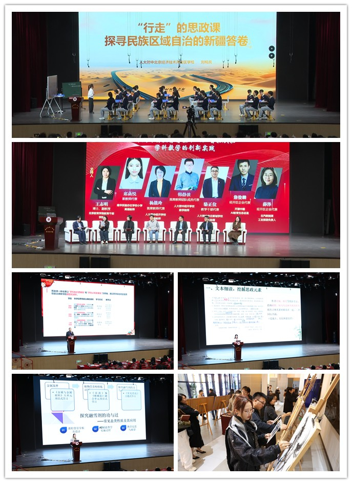 活动通过微课展示、说课分享、专家点评、跨界沙龙等环节展示参与学院培训后经开区教师专业成长的生动缩影。微课及说课彰显经开区"科技+思政"融合育人特色:人大附中经开学校的刘柯兵以"行走新疆"创设真实情境,构建"四维进阶"一体化体系,实现制度理性认同的深度跃升;人大附中经开学校、首席教师代表杨剑,以"学科知识逻辑链"和"学生认知发展链"为双轴,构建"主题一体化、目标进阶化、教学环节进阶化、评价进阶化"四维体系;二中经开学校、新教师代表白媛媛创新"内嵌式融入"课程思政,通过翠竹精神,达成革命文化与语文素养的浑然天成;亦庄实验中学、首席教师代表江媛媛构建"AI赋能+实验探究+社会思辨"跨学科模式,彰显"智联学科、慧育素养"的育人智慧,共同形成小初高贯通、情理交融、数智赋能的育人新格局。在人工智能赋能教学的沙龙环节,一线教师、教学干部与企业代表跨界对话,碰撞出教育创新的思想火花,勾勒出新域新质教育背景下的教学变革图景。
