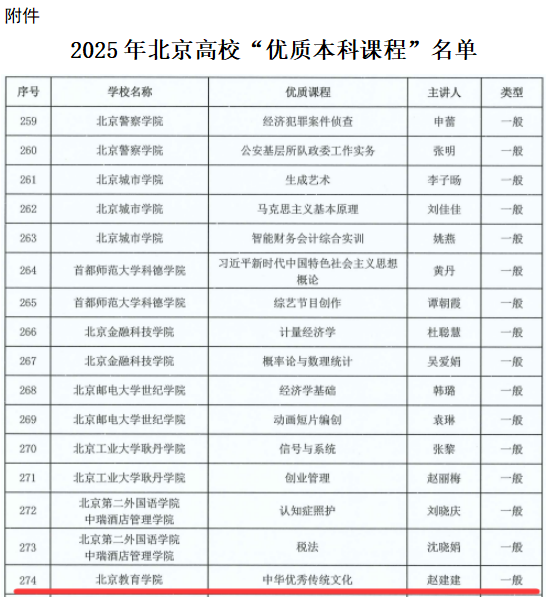 为深入贯彻落实《教育强国建设规划纲要(2024—2035年)》要求,巩固人才培养中心地位,北京市教委组织开展了2025年北京高校本科教学项目系列建设工作。本次评选中荣获三项市级教学建设的成果,全面展现了我院在教学改革与内涵发展中的显著成效。其中,《中华优秀传统文化》课程被评定为市级“优质本科课程”,该门课程深度融入课程思政理念,是文化育人与价值引领相融合的示范课程;在“优质本科课件”评选中实现零的突破,标志着我院数字化教学资源建设迈上新台阶;同时获批的市级“本科教学改革创新项目”,体现了我院在人才培养关键环节持续深化的改革探索。三项成果协同并进,彰显了我院在课程体系优化、教学资源创新与人才培养模式改革方面的实际成效。