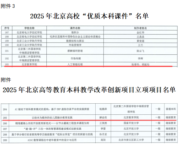 近日,北京市教育委员会公布了2025年北京高校本科教学项目系列评选结果,我院在多个评选中喜获佳绩,共荣获三项市级荣誉,标志着学院本科教育教学改革与质量建设取得新的成绩。