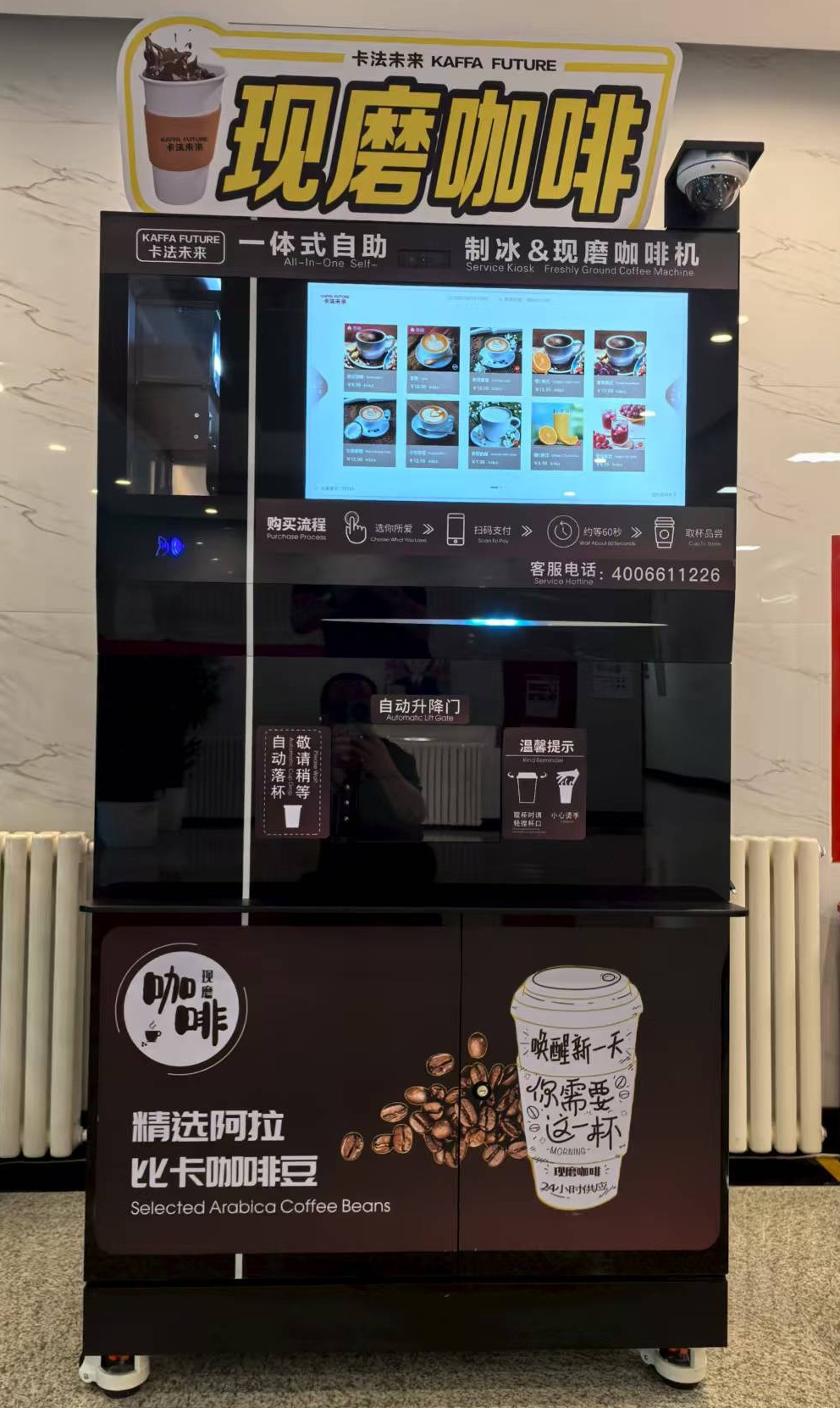 其中卡法未来咖啡选用集现磨、制冰、萃取、压盖、智能选择等功能为⼀体的全自动无人售卖现磨制冰咖啡机,精选来自埃塞俄比亚的阿拉比卡咖啡豆与新西兰进口优质奶源,拥有冷热饮品共19款。