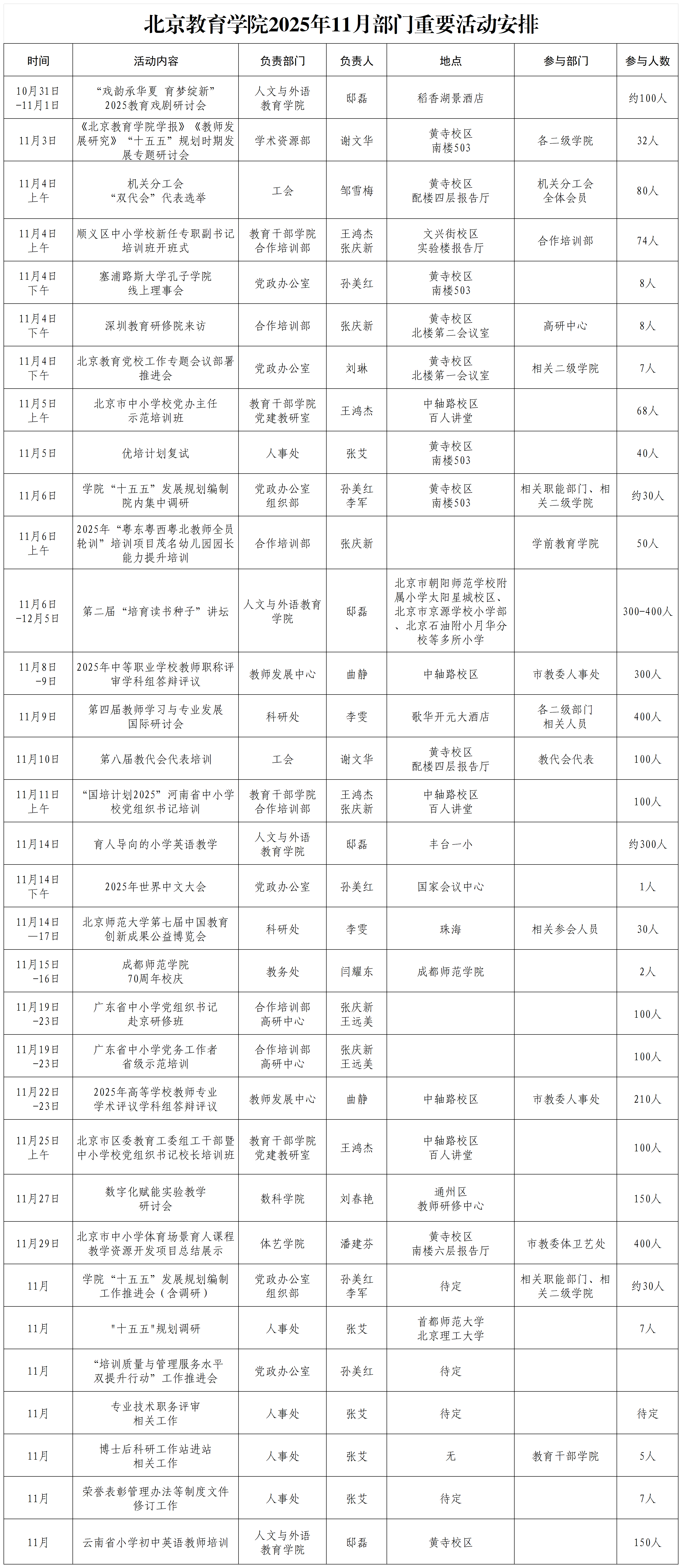 北京教育学院2025年11月部门重要活动安排