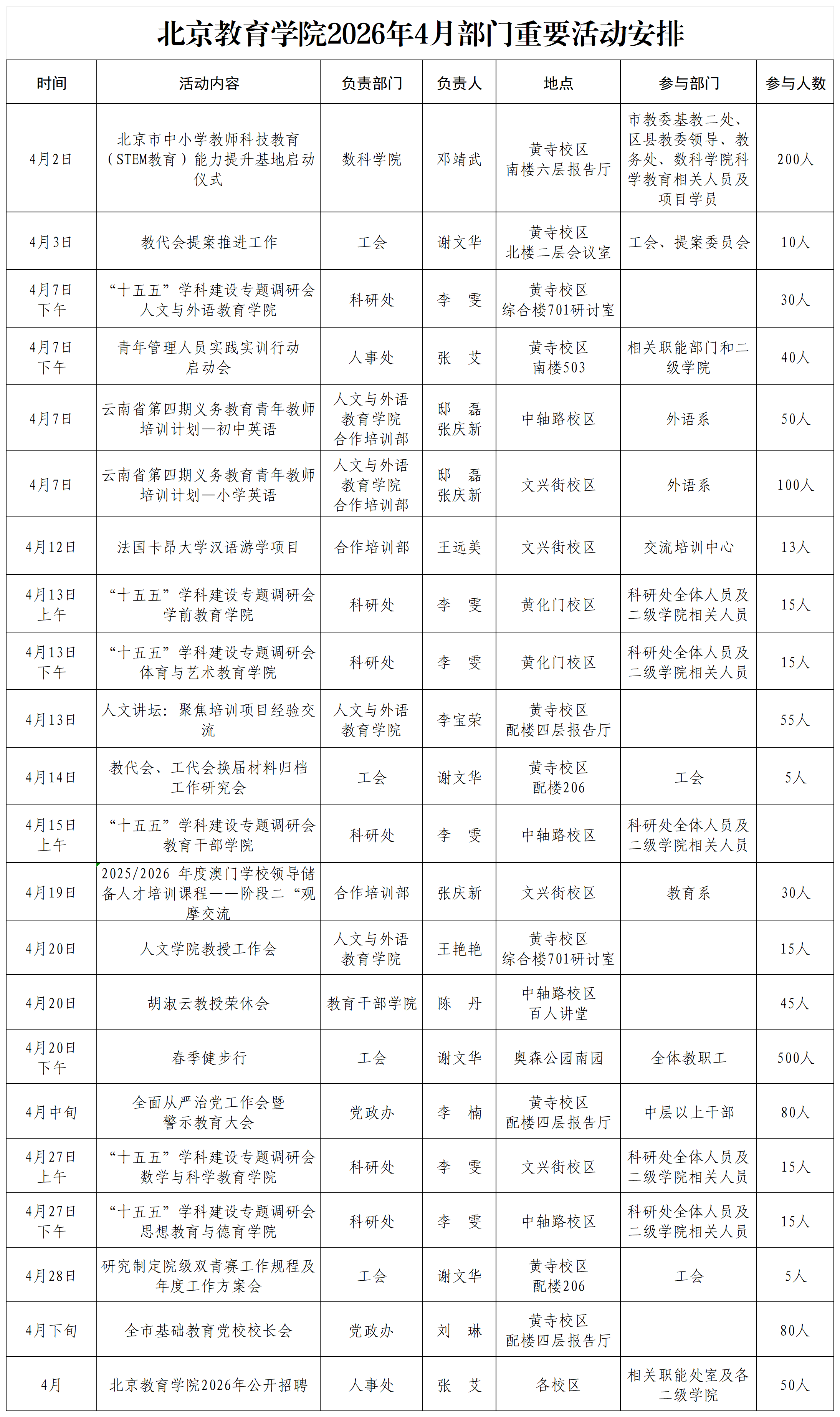 北京教育学院2026年4月部门重要活动安排