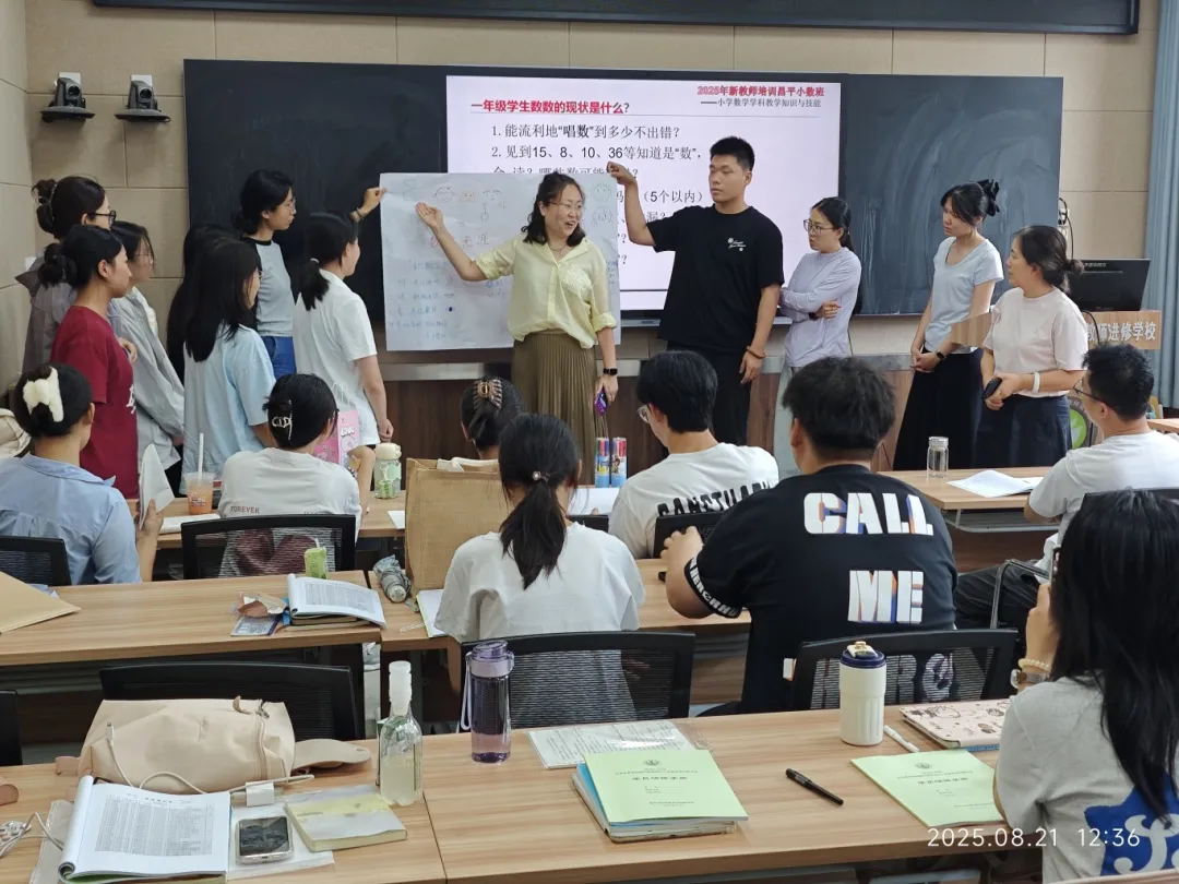 754名新任教师还按学科学段分为小学语文、小学数学、中小学道德与法治等31个班级,在院内外9个教学点开展线下集中培训。培训由思想政治教育与德育学院、人文与外语教育学院、数学与科学教育学院、体育与艺术教育学院、信息科技教育学院共五个二级学院共同承担,70余位院内教师、院外专家及一线优秀教师共同授课。培训通过参与式讲座、工作坊、微格教学等形式,聚焦新课标及教材解析、教学设计、备课与试讲等关键内容进行集训。学员全程积极参与互动,通过微格展示等方式“备好第一课”,为新学期教学做好准备。