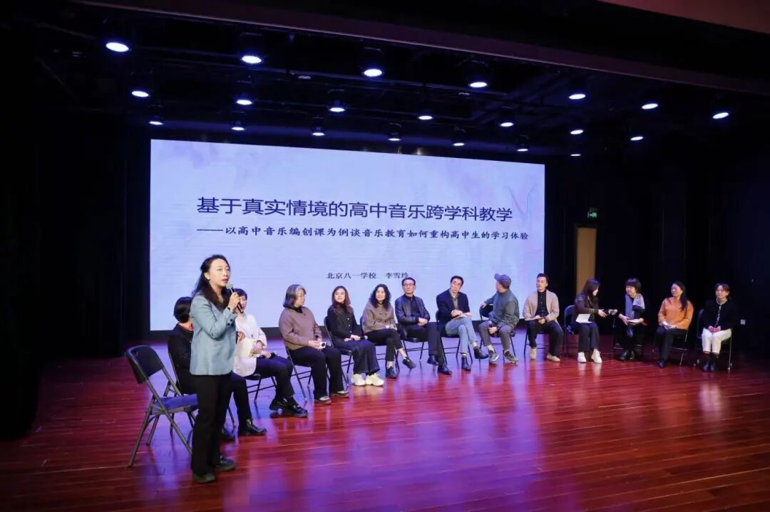 在教师研修主题中,北京市朝阳区教师发展学院李磊、西城区教育研修学院刘稳、北京教育学院体育与艺术教育学院音乐教师浦洁等分别从课堂教学创新、区域研修生态建设及音乐教学一体化等角度分享经验,提出以“课堂+场景”双路径推动教师专业成长。课程建设主题聚焦学科美育实践,北京市第十八中学米秋梅、海淀区中关村第三小学宋芳、海淀区教委崔腾军等从校本课程创新、美育课程体系建设及区域实施策略等方面进行了案例展示,展现出美育在课程设计层面的多样探索。跨学科教学沙龙研讨环节由北京教育学院音乐系教师傅聪主持,来自不同区的八位音乐教师及教研员代表围绕跨学科教学的三个核心议题展开探讨并分享实践经验。首都师范大学教授李刚、吕鹏,中国音乐学院副教授任恺,北京教育学院体育与艺术教育学院副院长赵楚、教师饶子龙等与会专家参与评议。