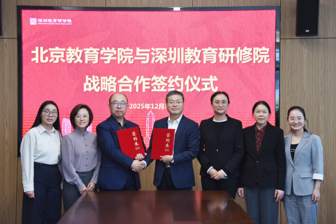2025 年 12 月 3 日,北京教育学院与深圳教育研修院战略合作协议签约仪式在深圳改革开放干部学院举行。北京教育学院党委常委、副院长肖汶,合作培训部主任张庆新,高级研修中心主任王远美;深圳教育研修院院长宋暖,常务副院长姚冬苹及相关项目负责人出席签约仪式。