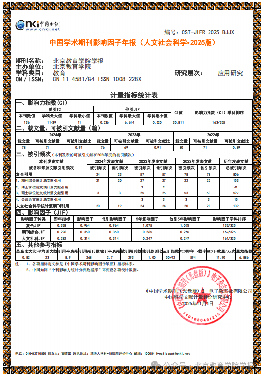 近日,中国知网发布《中国学术期刊影响因子年报(人文社会科学版)·2025版》,据显示,《北京教育学院学报》影响力指数(CI)值为:30.811,在教育类325种刊物中排名163位;复合影响因子为:0.964,较上一年度增长了37.1%,在教育类325种刊物中排名133位;WEB即年下载率为:594,WEB下载量为:11.9万次。期刊整体影响力得到显著增强。