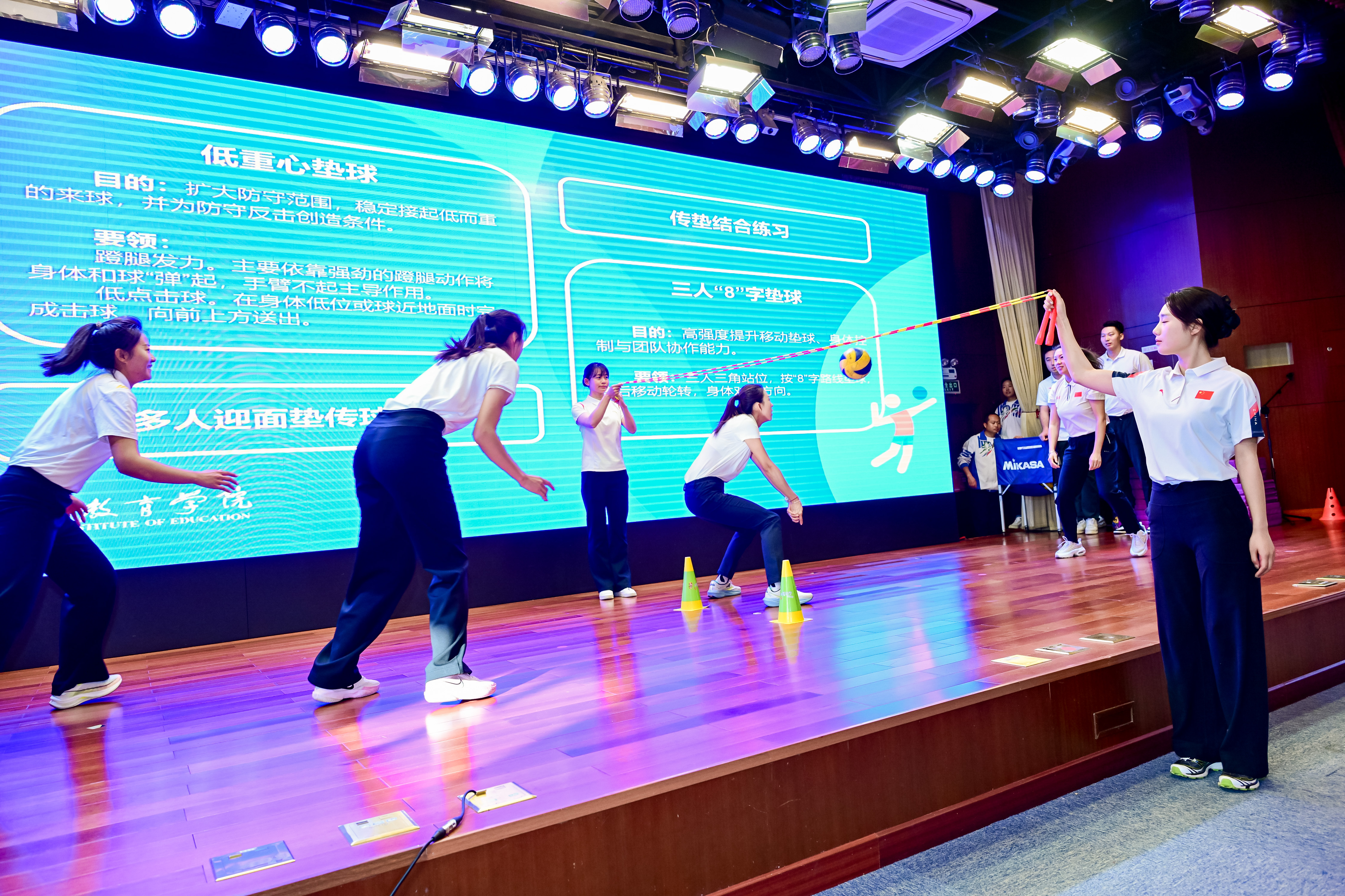 体育与健康主题单元教学工作坊中聚焦5个主题模块展开,包括基本运动技能大单元教学、跨学科主题学习、学生教材(涵盖健康教育及体育文化内容)单元、排球大单元教学、体育与健康学科美育教学指引单元。本环节通过现场教学展示、互动体验活动和真实课堂还原等多种形式,生动呈现了主题单元教学在新课标背景下的创新实施路径与扎实育人效果,为参训教师提供了可借鉴、可推广的实践范本。