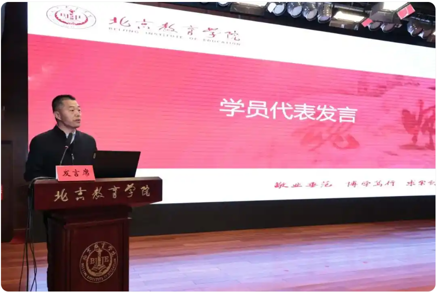 北京市古城中学校长周亚宏作为学员代表郑重承诺,将深入践行“健康第一”的理念,把本次培训成果充分运用到学校心理健康教育工作中,以心护心、以爱育爱,把心理健康教育做细做实、做深做优,落实全周期、全链条心理健康服务要求,为推进首都健康学校建设、护航青少年健康成长贡献力量。