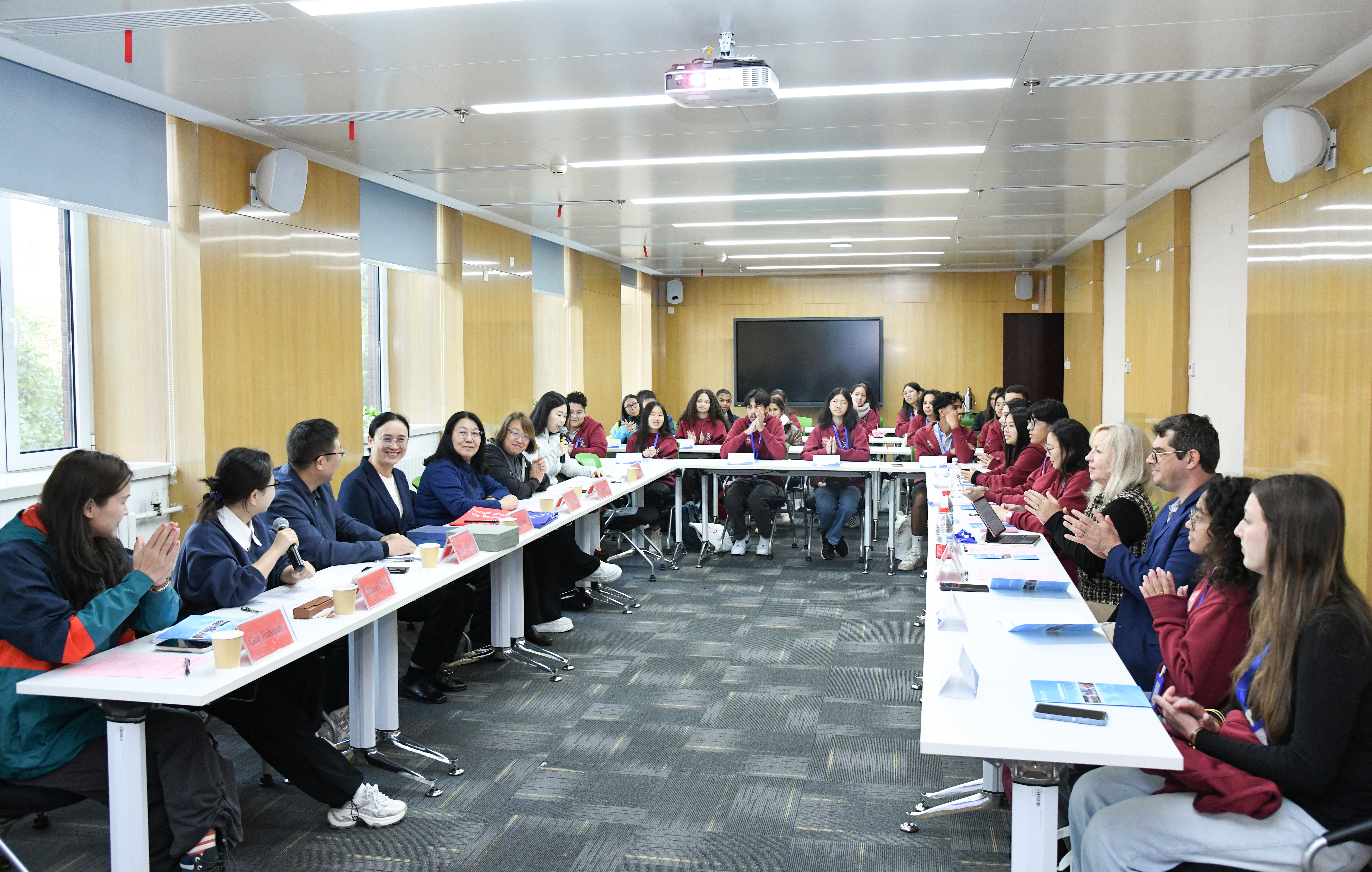 北京教育学院合作培训部主任张庆新、党政办/国际处副主任李楠,与法国 Levavasseur 高中教师 Christophe HEISSAT、PAQUIS Nelly 携手莅临;北京教育学院人文与外语教育学院教师常雪鹰、王秀荣,交流培训中心项目班主任高富欢老师,法国 Levavasseur 高中游学项目的 28名师生及家长全程参与,现场洋溢着期待与喜悦的氛围。