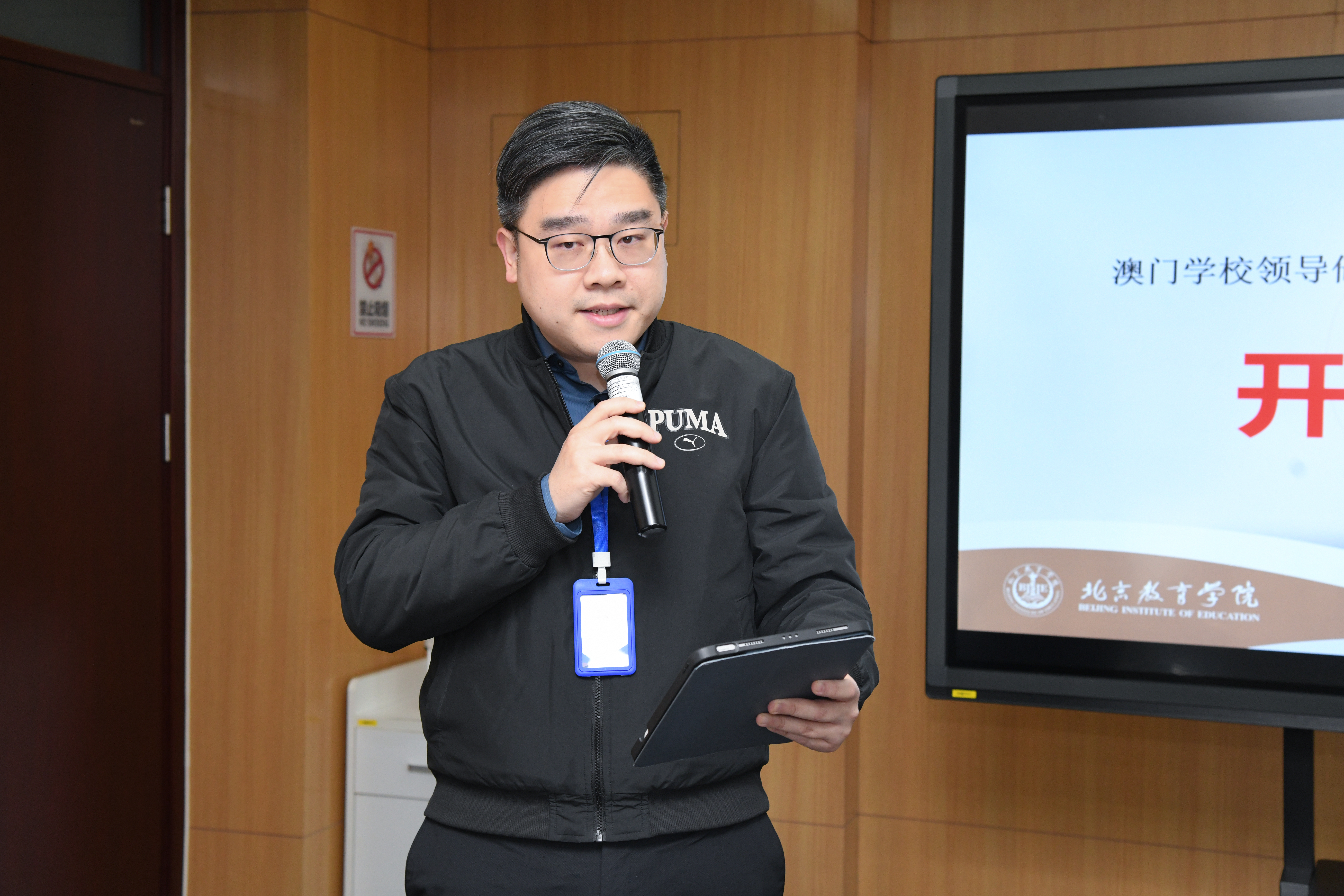 肖汶在讲话中对澳门教育同仁表示热烈欢迎。肖院长指出,北京教育学院自2019年起与澳门教青局持续合作,已建立起良好的合作基础。本次培训重点搭建三个平台,第一是政策学习的“瞭望台”,帮助学员把握教育强国建设时代背景;第二是实践研修的“活课堂”,组织学员走进北京学校开展“影子研修”;第三是深度交流的“朋友圈”,推动京澳双方围绕文化传承、科技赋能教育等共同关切深入对话。肖院长强调,澳门教育在国际化、多元文化融合等方面积累了宝贵经验,值得北京学习借鉴。希望学员在交流互鉴中厚植家国情怀、坚定育人使命。