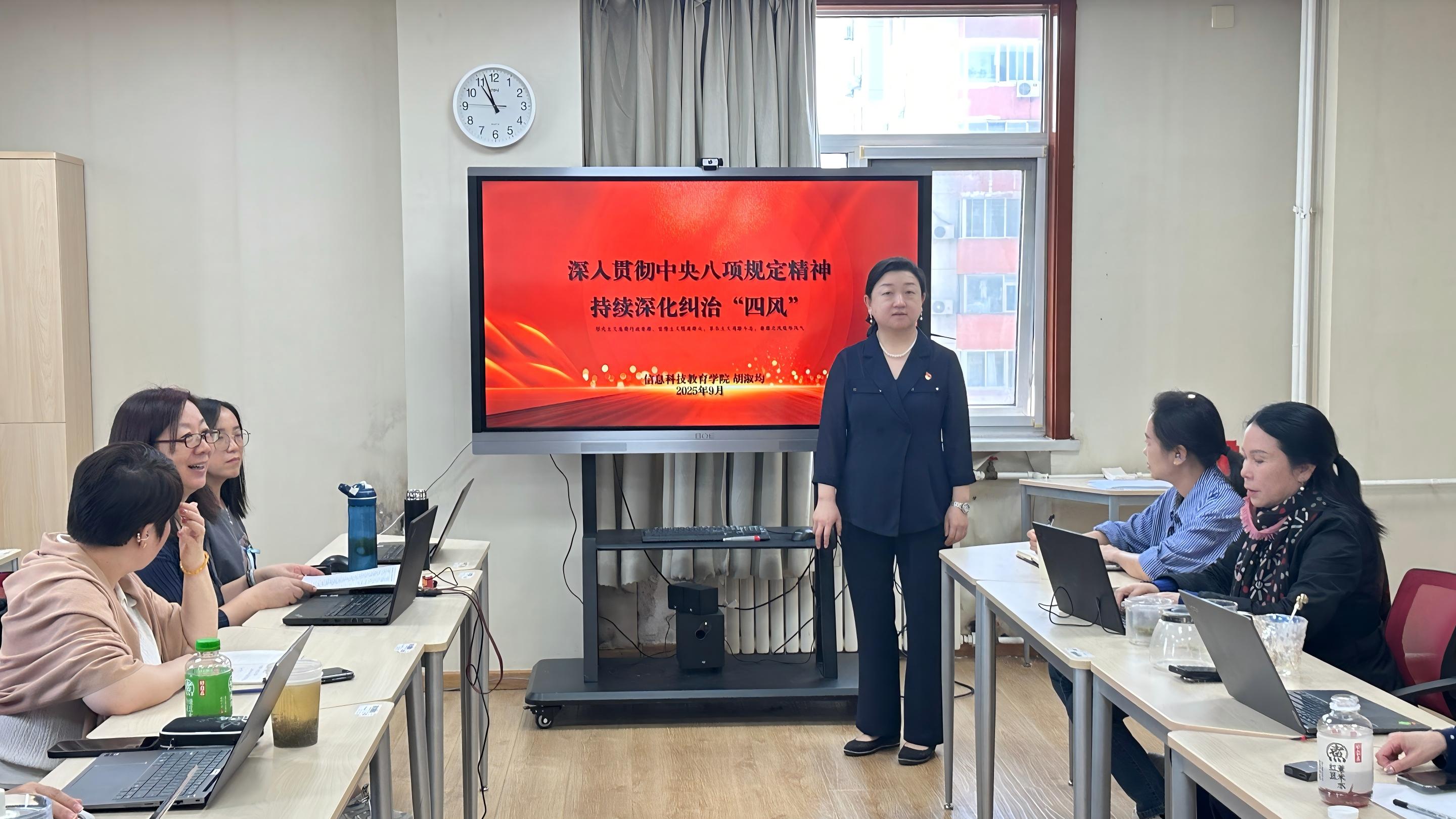 为深入学习贯彻习近平新时代中国特色社会主义思想,巩固拓展作风建设成果,9月29日上午,信息科技教育学院直属党支部组织全体党员开展主题党日活动,直属党支部纪委委员胡淑均围绕“深入贯彻中央八项规定精神、持续深化纠治‘四风’”讲授专题党课。