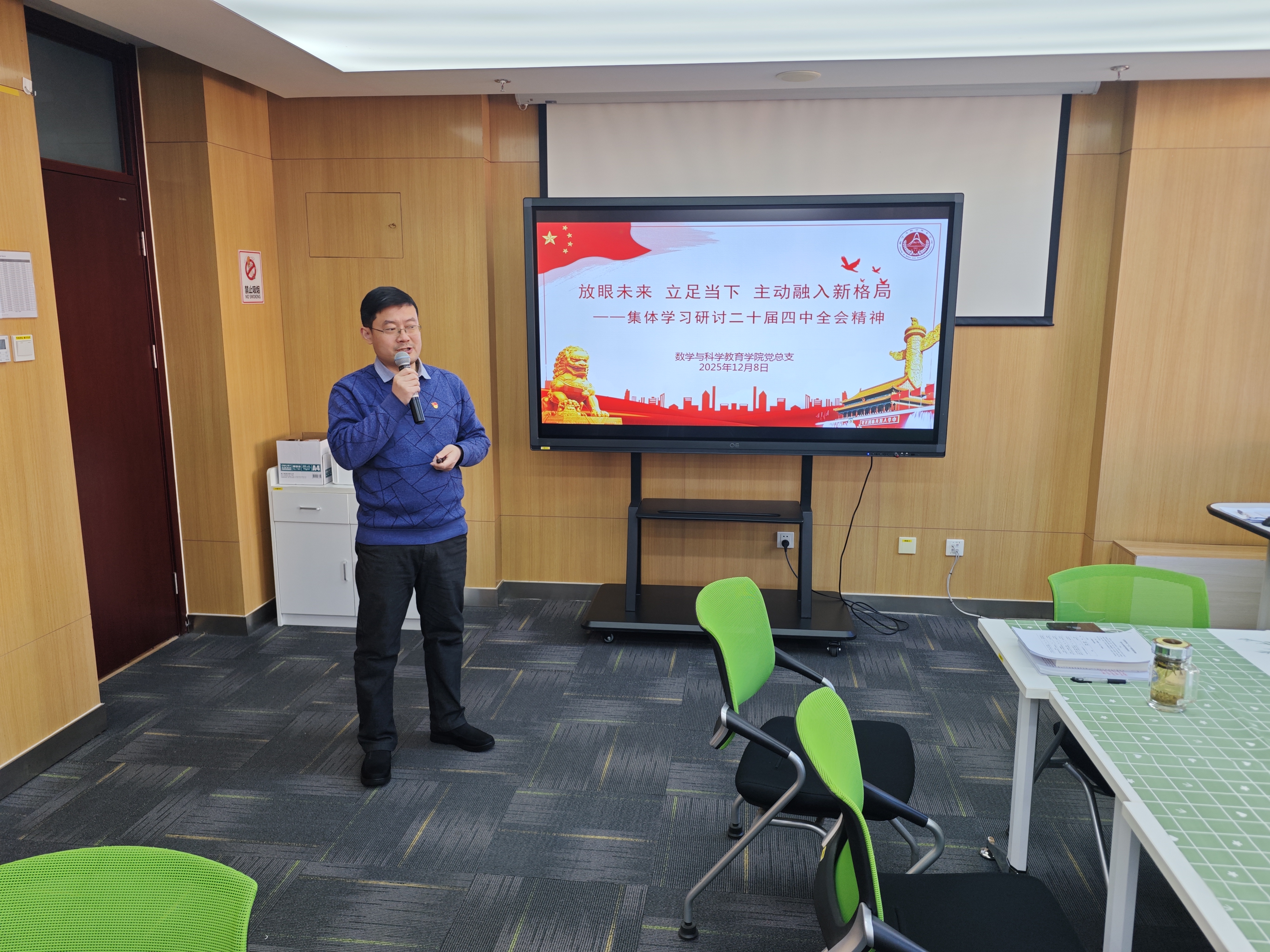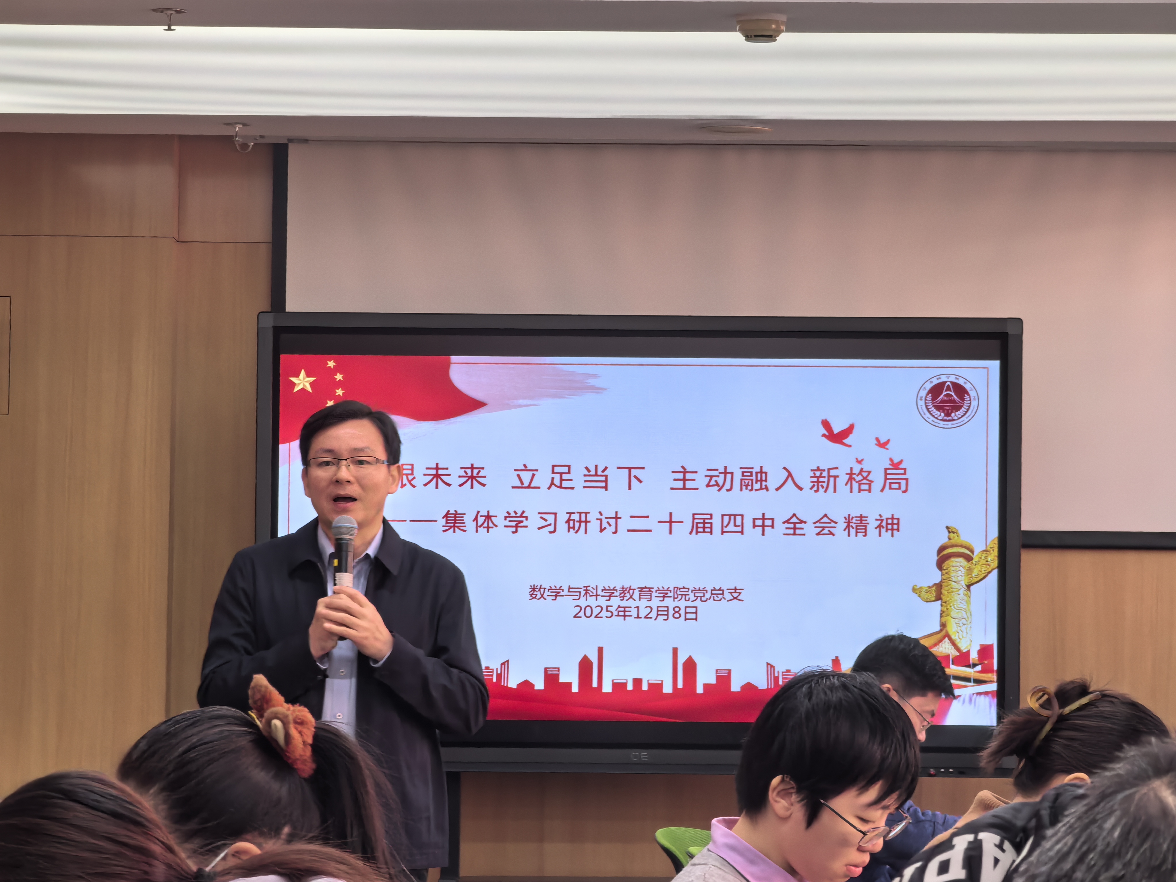 为深入学习贯彻党的二十届四中全会精神,准确把握“十五五”规划发展要求,科学谋划学院未来发展蓝图,数科学院全体教职工于12月8日在文兴街304集中学习研讨党的二十届四中全会精神,会议由数科学院院长邓靖武主持。王钦忠书记以《放眼未来,立足当下,主动融入新格局》为题作专题党课,旨在通过集中学习和工作坊研讨的形式,推动全会精神入脑入心,认真开展“十五五”规划调研工作,引导全体教职工将思想和行动统一到党中央决策部署及市委、学院党委的工作要求上来,为学院“十五五”时期高质量发展奠定坚实思想基础。