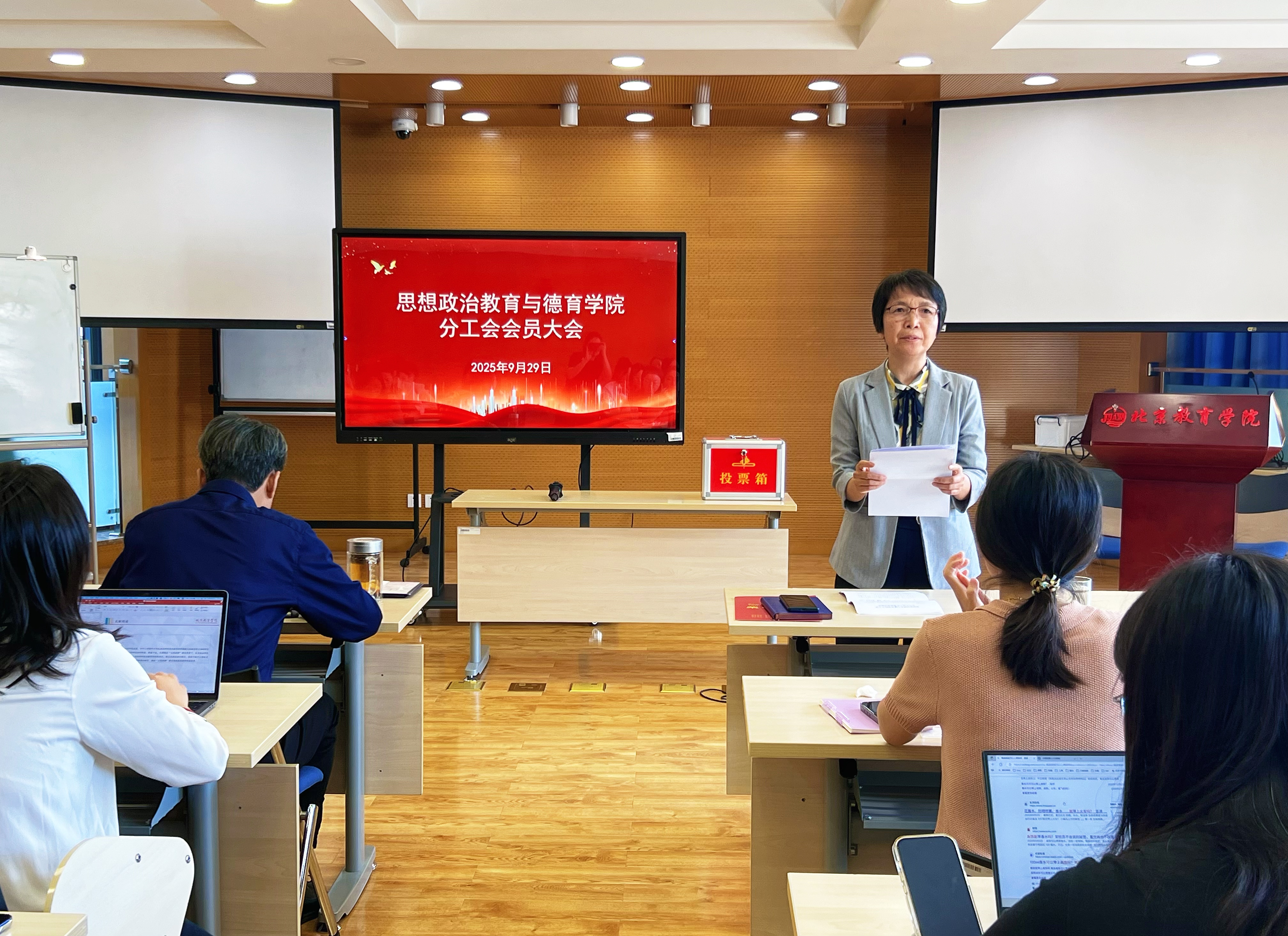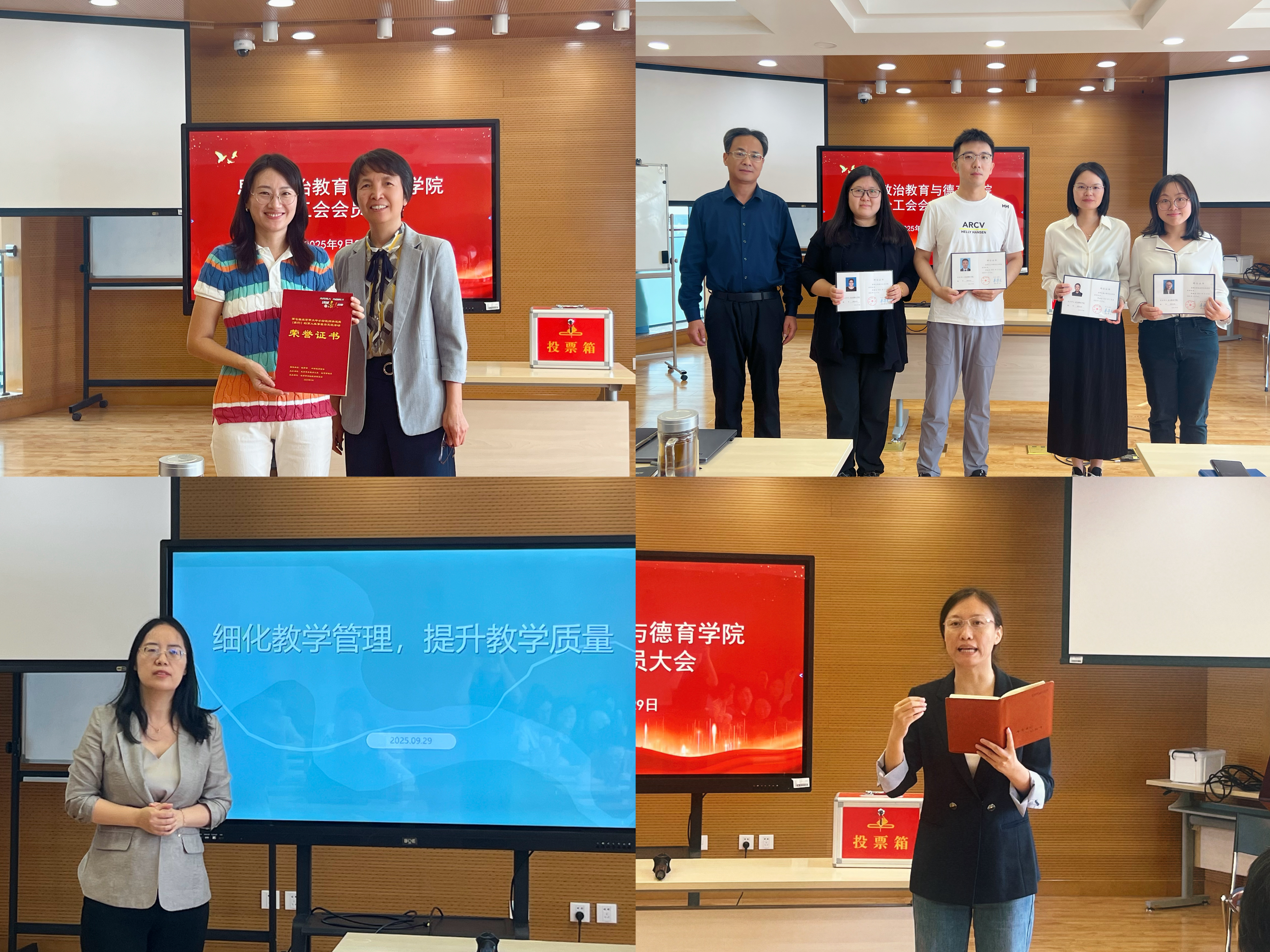 选举会后,思政学院召开全体教职工大会。会上,李淑君书记为在北京市讲述育人故事展示交流活动中荣获“优秀育人故事案例”二等奖的林雅芳老师颁发荣誉证书,尚九宾院长为新一批获得教师资格的教师颁发证书。沈彩霞副院长就教学质量管理和教学督导工作进行安排,李巾姝副院长传达了校园安全管理工作培训部署会会议精神,强调做好安全隐患排查,守牢意识形态阵地,提醒教师加快预算执行进度。最后,李淑君书记强调要认真履行出京、离境请假报备制度和返京及时销假制度,严格遵守中央八项规定精神,度过一个廉洁、安全、快乐的假期。