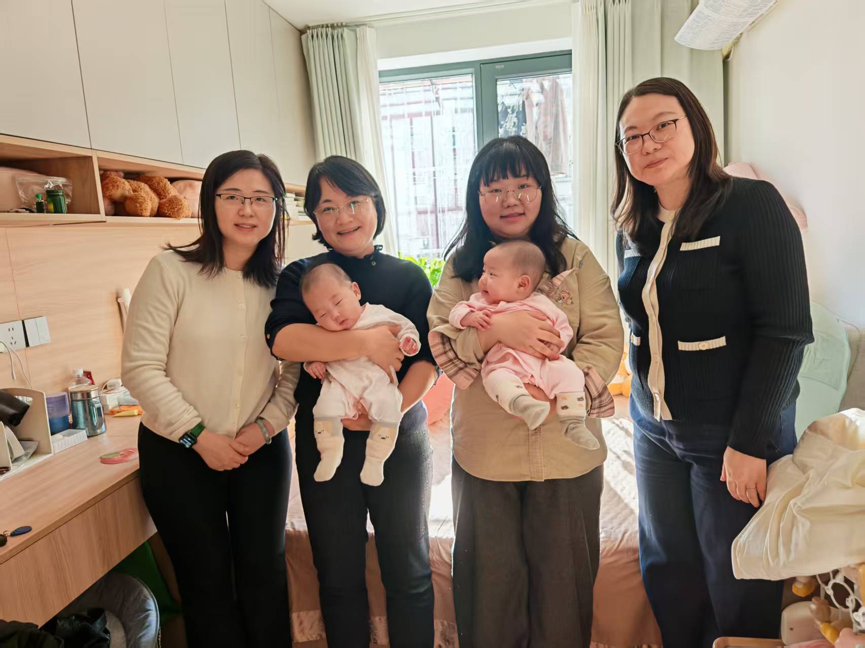 在张老师家中,一行人向张老师表示祝贺,转达了学院对她的关心与问候。她们亲切地询问了张老师的身体恢复情况,详细了解了双胞胎宝宝的健康状况,叮嘱张老师要安心休养,保重身体,享受这份甜蜜的喜悦。