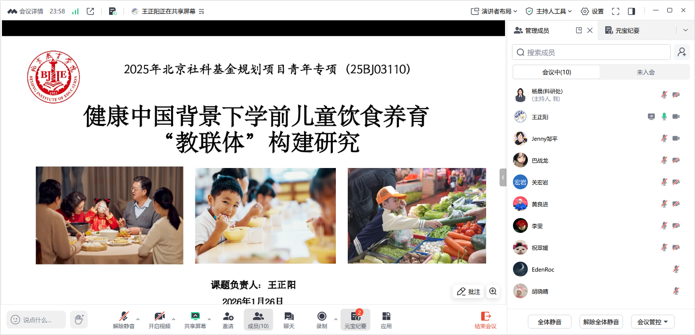 2026年1月26日,科研处(学科建设办公室)组织召开2025年度北京社科基金青年项目线上开题论证会。本次会议特邀北京师范大学巴战龙教授、首都儿科研究所附属儿童医院婴幼儿养育照护中心主任关宏岩研究员、北京市第五幼儿园邹平园长担任论证专家,课题负责人北京教育学院学前教育学院王正阳博士及课题组成员参会,会议由科研处处长李雯教授主持。