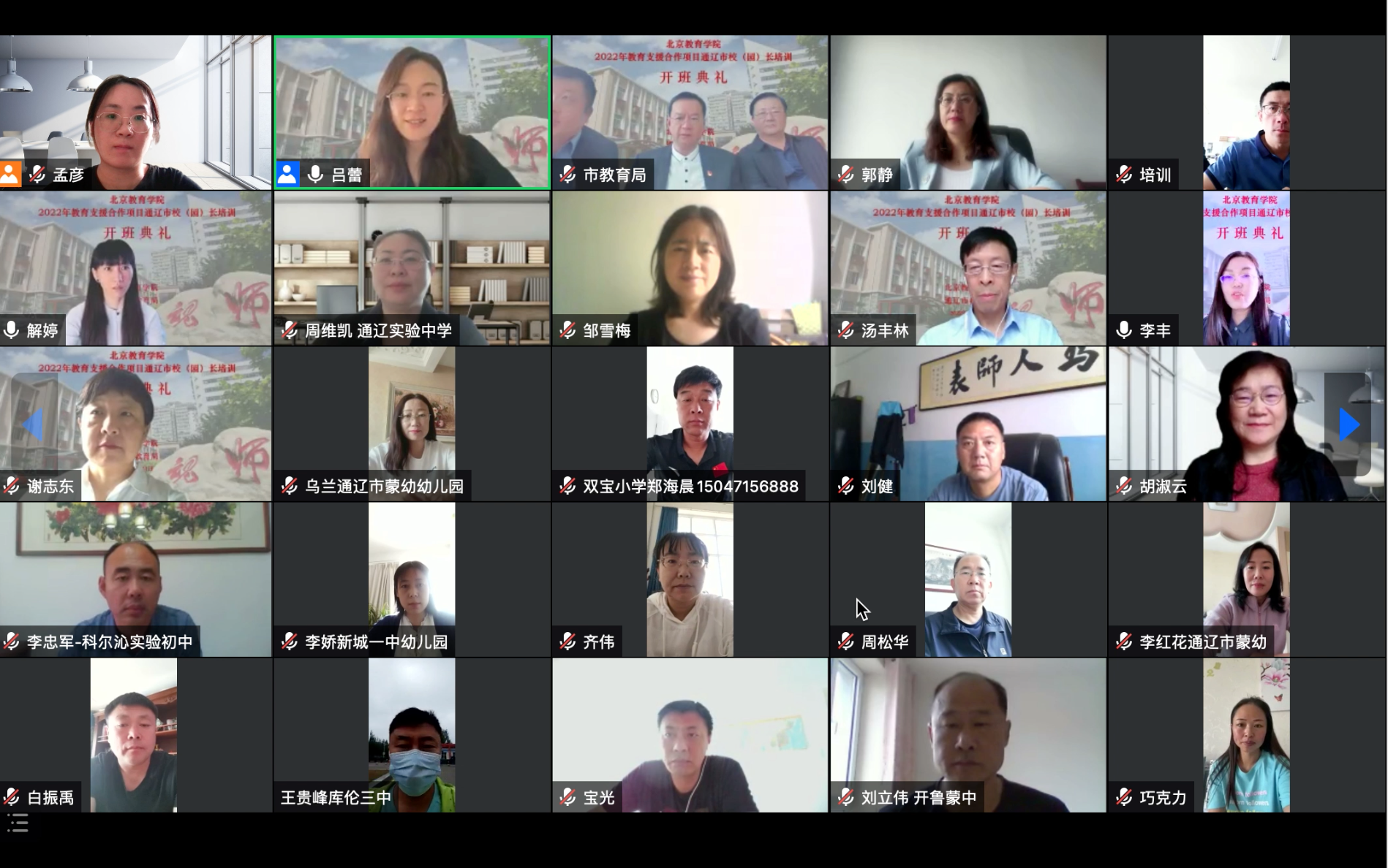 6月11日上午,北京教育学院2022年教育支援合作项目通辽市校(园)长培训开班典礼通过腾讯会议平台顺利举行。该培训任务由教育管理与心理学院(教育干部学院)和学前教育学院共同承担。北京教育学院副院长汤丰林、通辽市教育局副局长田向阳以及北京教育学院教务处副处长邹雪梅、教育干部学院院长胡淑云、学前教育学院院长谢志东、项目团队成员和25名校(园)长学员参加了开班仪式。