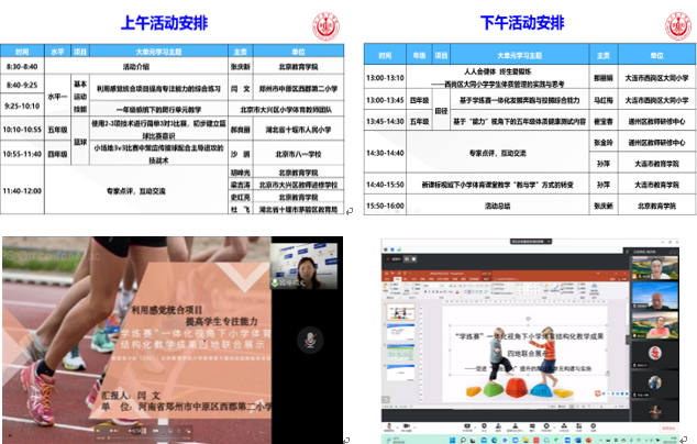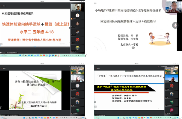 本次在线联合研训活动主要是由来自于河南省郑州市中原区西郡第二小学闫文老师、大兴区体育教师团队、湖北省十堰市人民小学郝良丽老师、北京市八一学校沙鹏老师、大连市西岗区大同小学马红梅正高级老师、通州区教师研修中心崔宝春老师进行水平一基本运动技能、水平二三专项运动技能中的篮球和田径的大单元教学构建与实施,重点展示体现新课标理念的1个学期18课时的大单元教学设计,代表性课时教学设计与教学课例。六位展示教师结合基本运动技能中的移动性运动技能、非移动性运动技能、操控性运动技能,以及专项运动技能中的开放式运动技能和封闭式运动技能的特性,抓住“学练赛一体化”“结构化教学”“学生学习为中心”“真实情境”“运动项目完整体验”“课课练、课课赛”等内核要点展开体现新课标与新理念的“学练赛”一体化视角下小学体育结构化教学阶段性成果。