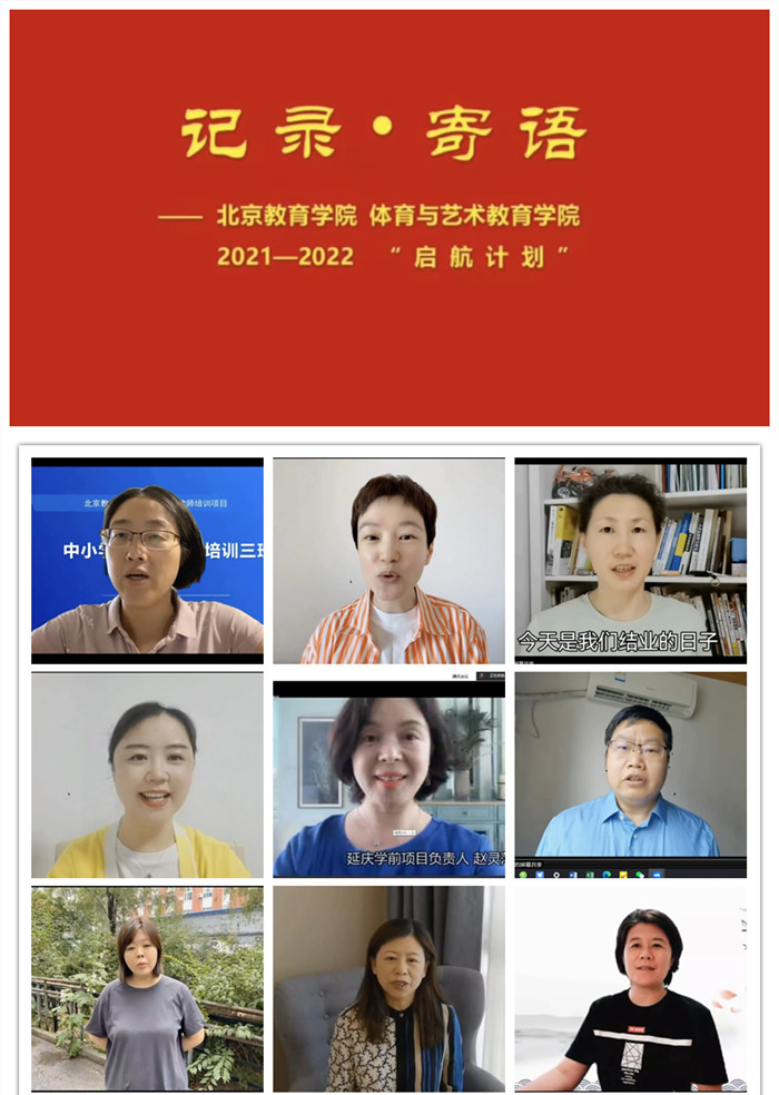 6月30日上午,体育与艺术教育学院在线举办主题为“新时代、新青年、新教师、新起点”2021级音体美新任教师结业典礼。北京教育学院卢晖副书记、北京教育学院汤丰林副院长、北京教育学院教务处张金秀处长、王丁老师、昌平区教师进修学校师训办张丽芳主任、顺义区教育研究和教师研修中心师训办王振江主任、怀柔区教科研中心师训办于晓龙主任、延庆区教育科学中心师训办胡红宇主任、大兴区教师进修学校师训办王宁主任以及五个区各学科的教研员们,体育与艺术教育学院领导班子、各新教师项目首席培训师、培训学员等共同参加了结业活动。结业典礼由来自延庆区第四小学体育新老师袁嘉林、顺义区黄城根小学顺义分校音乐新老师薛萌主持,在线参会人数近300人。