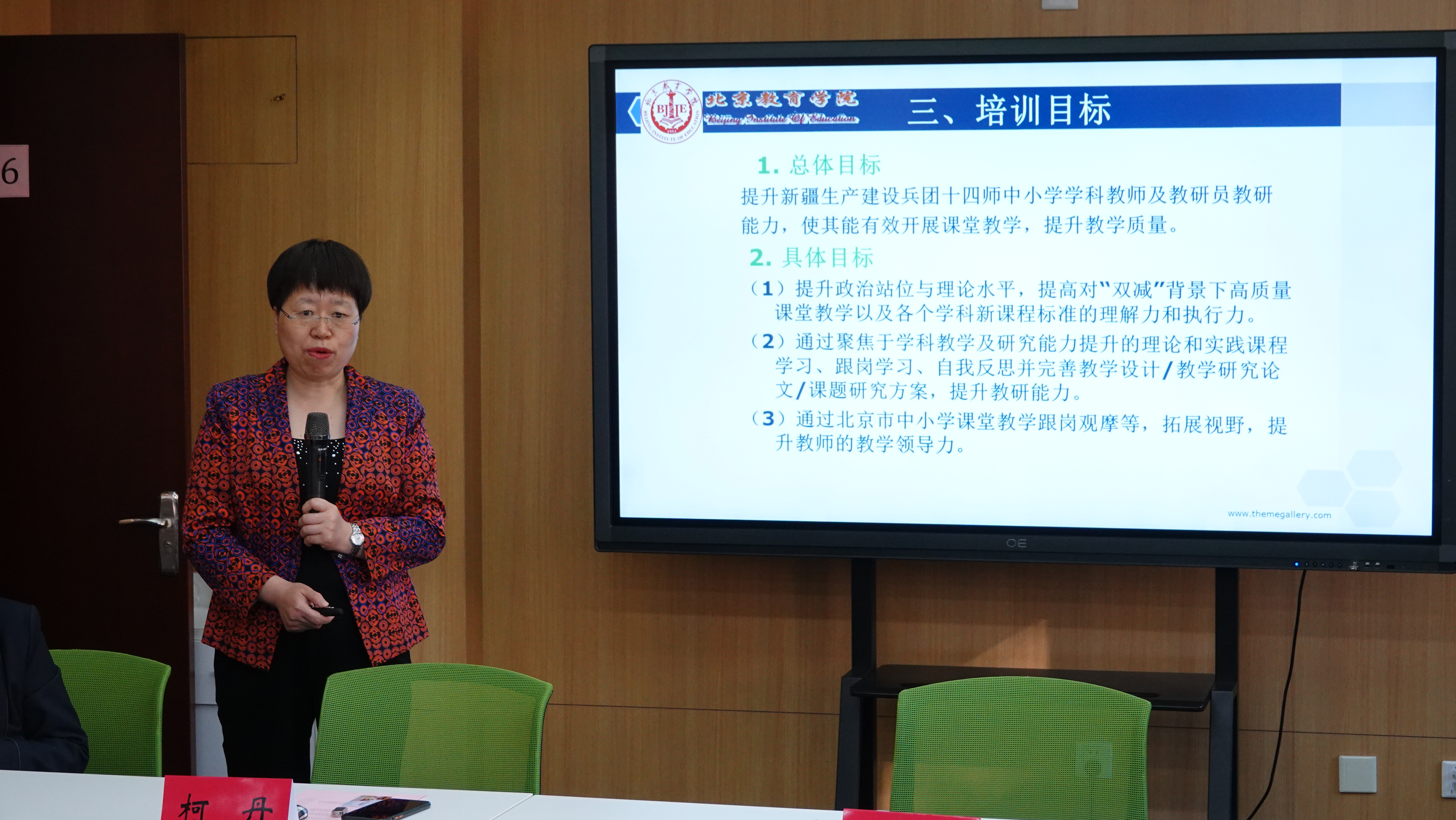 项目负责人李宝荣副院长进行了培训方案解读,从培训的主题、目标、课程模块、教学安排、学习形式、培训过程性考核及结业要求等方面对培训方案做了全面详细的解读。本次培训结合新疆生产建设兵团第十四师教育局提升中小学教师教研能力专项培训相关要求,以实际问题为导向,以专家引领,以实践探究为抓手,旨在培养一支教研理念先进、教学及研究能力强的中小学学校教师队伍。培训主题为“中小学教师教研能力提升”,依据学情调研,21天的培训课程设计三个模块,模块1. 新课程理念提升课程:包括各个学科义务教育阶段课程标准(2022年版)解读,北京市各学科优秀教师的课堂教学跟岗学习、学科教研活动体验等。模块2. 教学研究能力提升课程:教学研究方法、课例研究方法等课程。模块3. 教学实践及成果展示课程:教学设计/主题研究方案指导、主题教学反思论文写作指导、研修成果写作及展示指导等,以多种形式的个性化实践指导课程提升新疆中小学的教研能力。