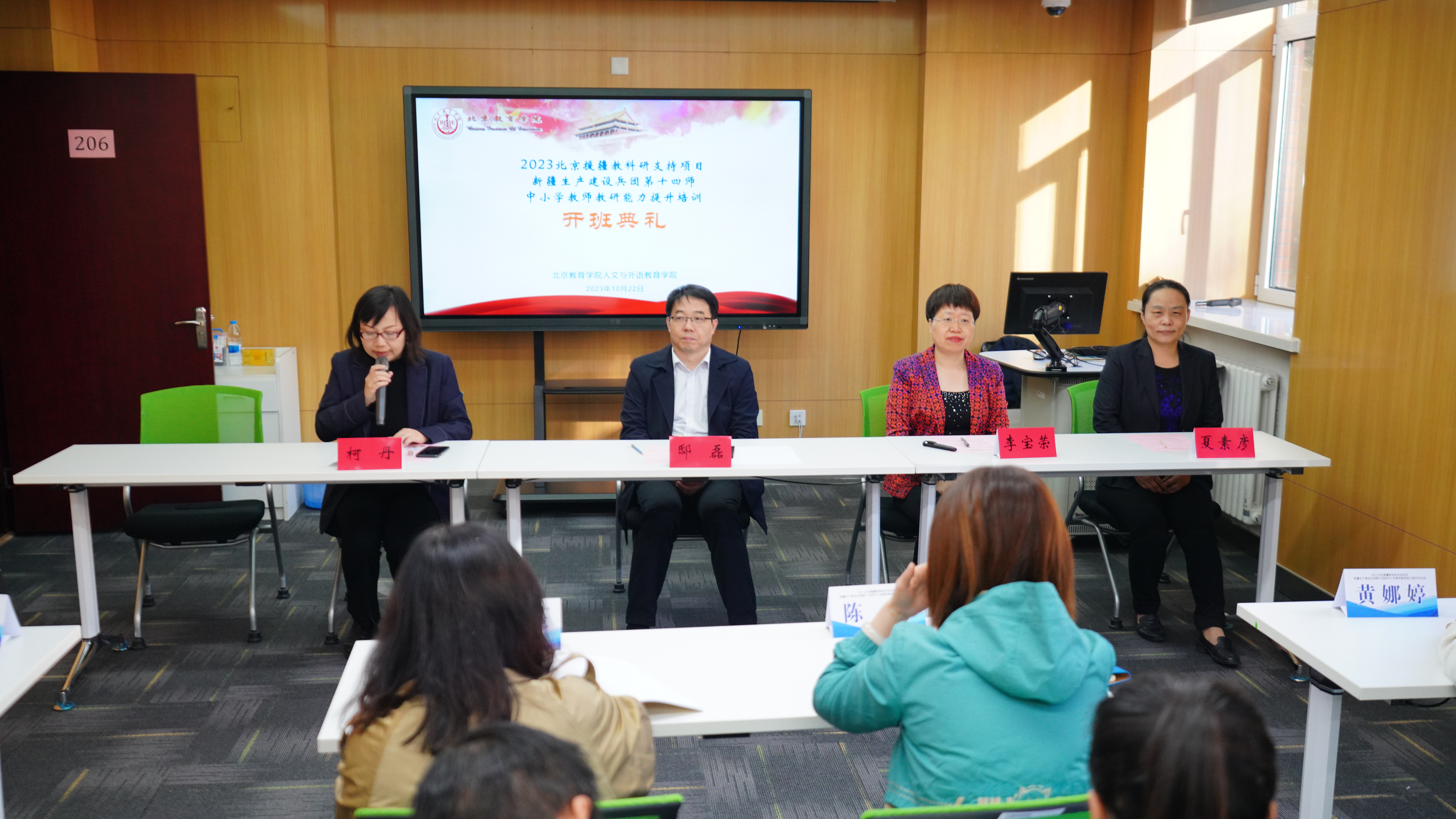 10月22日上午,受北京市教委援培办委托,我院人文与外语教育学院承办的2023北京援疆教科研支持项目新疆生产建设兵团第十四师中小学教研能力提升培训项目在北京教育学院文兴街校区主楼204室举行开班典礼。典礼由项目班主任、北京教育学院人文与外语教育学院柯丹老师主持,人文与外语教育学院邸磊院长、项目负责人、人文与外语教育学院李宝荣副院长、项目助理人文与外语教育学院夏素彦老师以及28名项目学员一起参加了典礼。