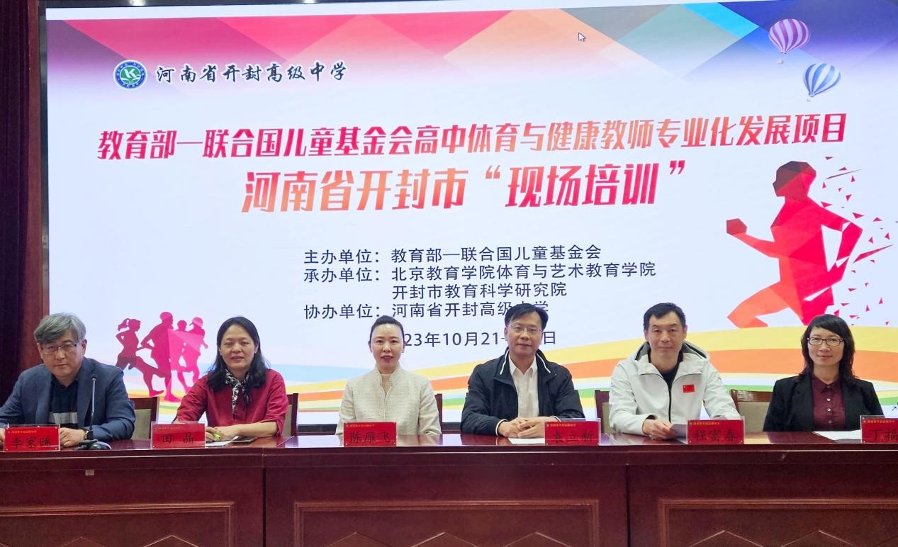 10月22日,教育部—联合国儿童基金会“高中体育与健康教师专业化发展”培训项目河南省开封市“现场培训”在开封市高级中学拉开帷幕。项目总负责人原北京教育学院体育与艺术教育学院院长、教授陈雁飞,北京教育科学研究院基础教育研究中心体育教研员田晶,河南省基础教育课程与教学发展中心副主任丁武营,河南省基础教育课程与教学发展中心中学部主任、体育教研员,现商丘市教育体育局副局长刘俊凯,开封市教育科学研究院院长吕中伟,河南省开封高级中学副校长刘培兵及开封项目执行负责人北京教育学院体育与艺术教育学院袁立新,教育学院丰台分院高中体育教研员程富春,北京市第三十五中学体育教师丁福芹,培训项目学员及河南省属市县体育教研员和高中骨干体育教师等共计400余人参加开班典礼。开封市教育科学研究院体育教研员李家晞主持开班典礼。