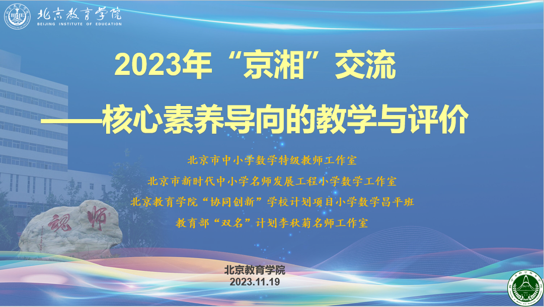 为促进京湘两地小学数学教师深入了解和开展专业交流,促进教师数学教育教学能力的提升。2023年11月19日上午,北京市中小学数学特级教师工作室、北京市新时代中小学名师发展工程小学数学工作室、北京教育学院“协同创新”学校计划项目小学数学昌平班三个项目团队与教育部“双名计划”李秋菊名师工作室团队齐聚北京市教育学院文兴街校区,开展了“2023年“京湘”交流——核心素养导向的教学与评价”研讨活动。