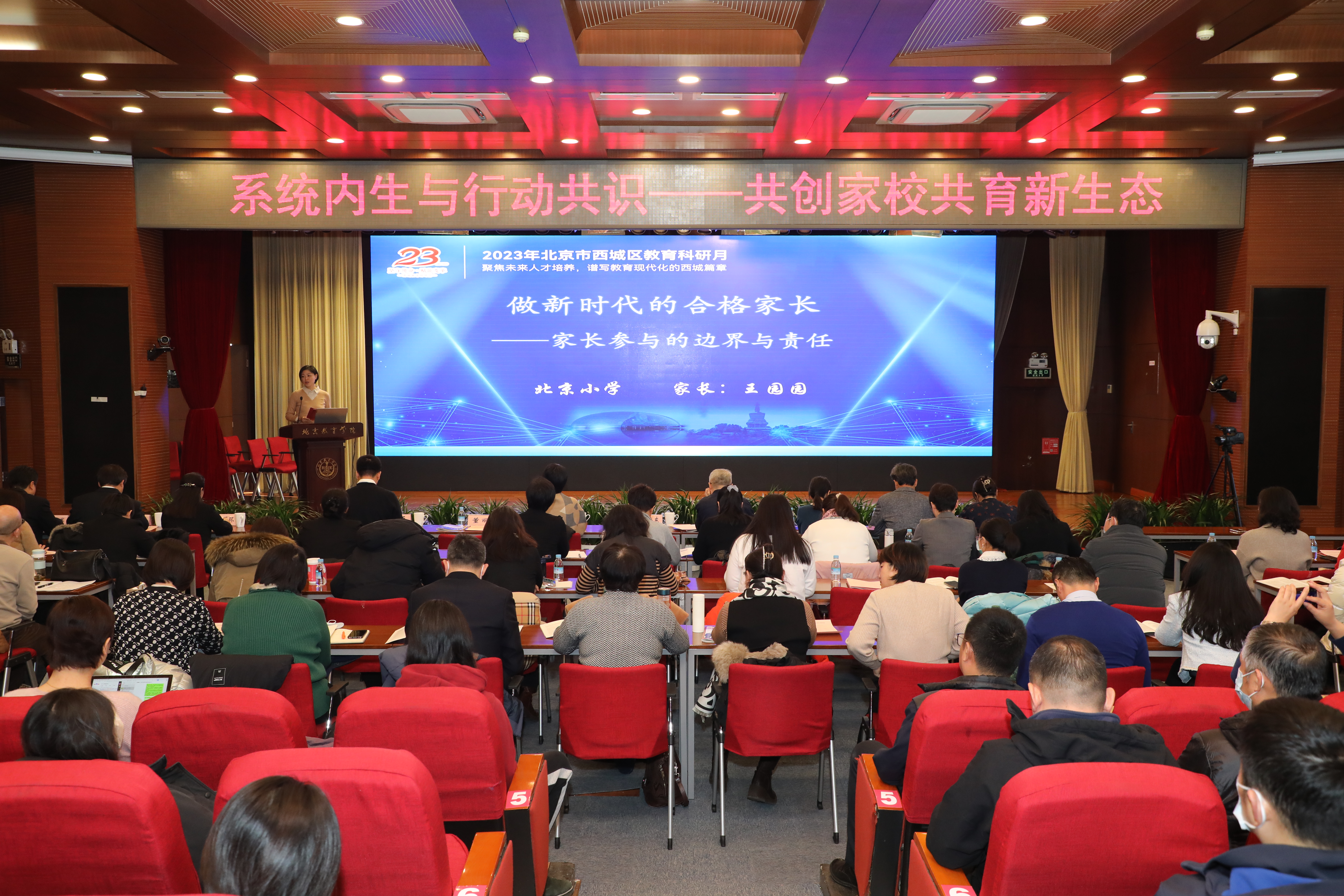 主旨发言环节,共话家校共育新探索。北京市西城区育民小学、北京市第十三中学、北京市西城外国语学校、北京第二实验小学、北京小学的干部、家长分别从学校家校共育系统的构建及实践、家委会机制建立及对家校共育工作的促进、“三位一体”切实提升教师家校共育能力、以“月话题”为载体构建家校协同育人桥梁、新时代家长参与的边界与责任五个方面阐述了生发于基层实践中的对家校共育的深刻理解和探索创新。