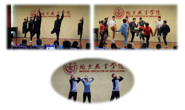 来自小学1班、2班和中学班的体育教师分别进行了非正常体重学生体能学练的培训成果展示,包括集体健身操、动态拉伸+素质练习、体能干预课等内容。