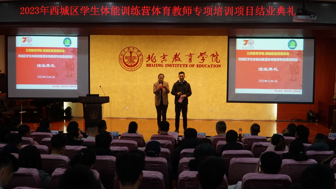 12月1日上午,西城区学生体能训练营体育教师专项培训结业典礼暨体能论坛在北京教育学院黄化门校区举办。本次培训以“指向非正常体重学生体能训练营的活动设计与干预指导”为主题,培训时间为2023年6月-12月,培训学员为西城区100所中小学校的100名体育教师。通过为期6个月的培训,帮助西城区中小学体育教师强化立德树人、雕琢青少年强健体魄的责任和使命,提升指导非正常体重学生体能锻炼的新理念、新知识、新方法和新技术,掌握指向不同锻炼主题的活动设计、方法实操,提高指导学生体能锻炼的评估诊断、运动干预和家校协同育人能力。北京教育学院副院长杨建新、西城区教委副主任芦乃静、体育与艺术教育学院党总支书记周志勇、院长潘建芬、副院长张庆新、西城区教委体卫艺科科长毕正勇、《中国学校体育》杂志编辑部主任郝俊、北京教育学院体育系副主任姜宇航、史红亮、西城体育教研员和西城体育名师出席结业典礼,会议由培训学员白皙和体育系青年教师易建斌主持。