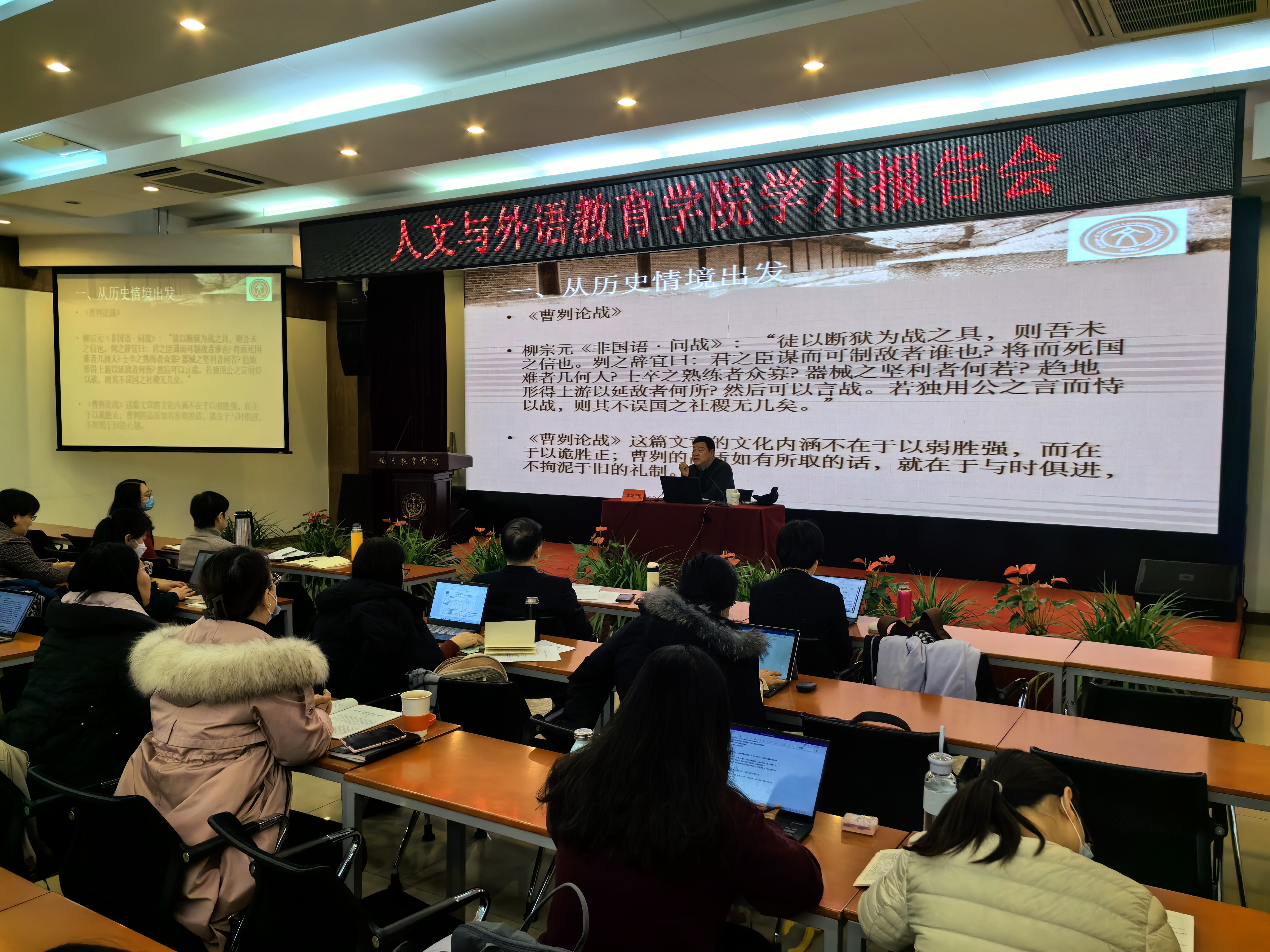 为更好弘扬中华优秀传统文化,推动传统文化与学科教学深入融合,持续推进学科创新平台建设工作,增进各系、各学科及各平台之间的交流学习,2023年12月11日上午,人文与外语教育学院邀请河北大学副校长、北京师范大学中国传统文化研究中心主任、教育部长江学者奖励计划特聘教授、教育部教学指导委员会中文学科委员、教育部“国培计划”专家过常宝教授开展题为《传统文化与中学古文教学》专题讲座。人文学院全体教职工参加了此次会议。会议由人文与外语教育学院副院长胡春梅主持。