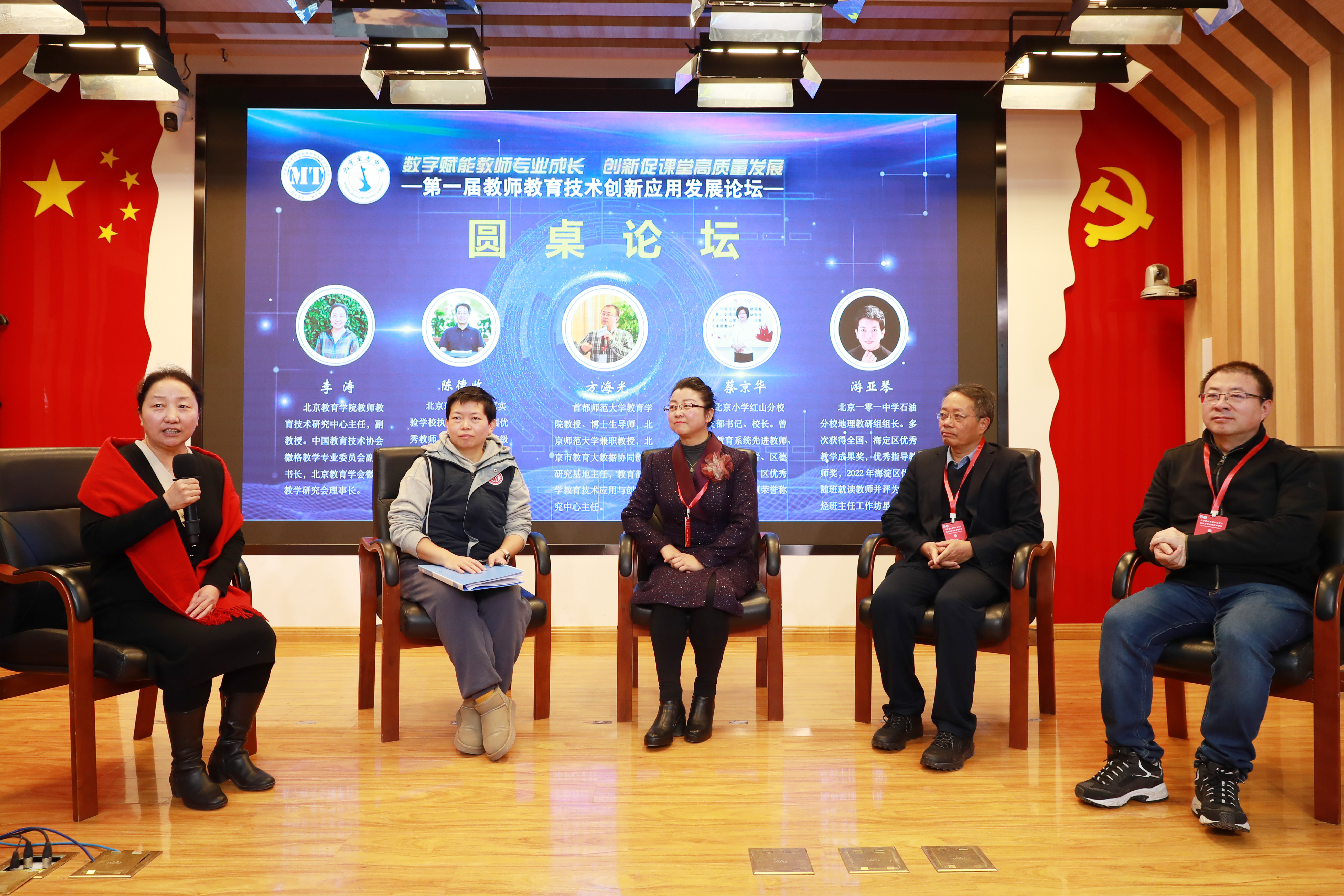 北京教育学院教师教育技术研究中心李涛主持了圆桌论坛,邀请首都师范大学教育学院方海光教授、北京理工大学附属实验学校陈德收校长、北京小学红山分校党支部书记、蔡京华校长和北京一零一中学石油分校地理教研组组长游亚琴老师,分别从专家、校长和教师角度畅谈了对教育数字化转型的认识和体会。