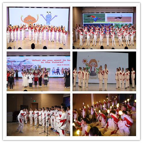比赛由四(7)班的王星澜、六(5)班的张云迪、1+3项目初三(1)班的赵泽元、中外合作办学项目高一的陈怡文同学主持,共分为“美好生活”“远大理想”“关爱世界”“唱响未来”四个篇章。同学们借由歌曲,唱出自己的心声。小学学段的同学们学习了生活相关场景的英文表达后,用歌曲唱出自己开心的一天;小学中高段和高二的同学们通过歌曲,唱出了自己追梦的态度;初中和高中的同学们唱出了对世界的关爱。所有参赛班级演唱结束后,三(10)班的陈秋衡同学演唱英文歌曲Sunshine,渲染了轻松欢乐的现场氛围。