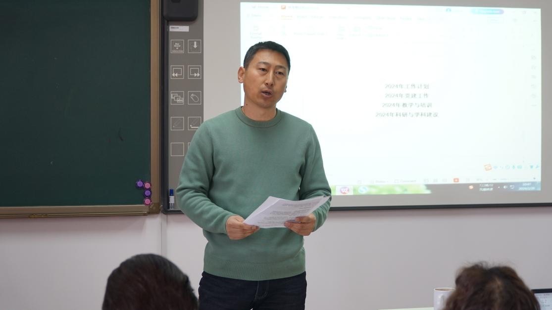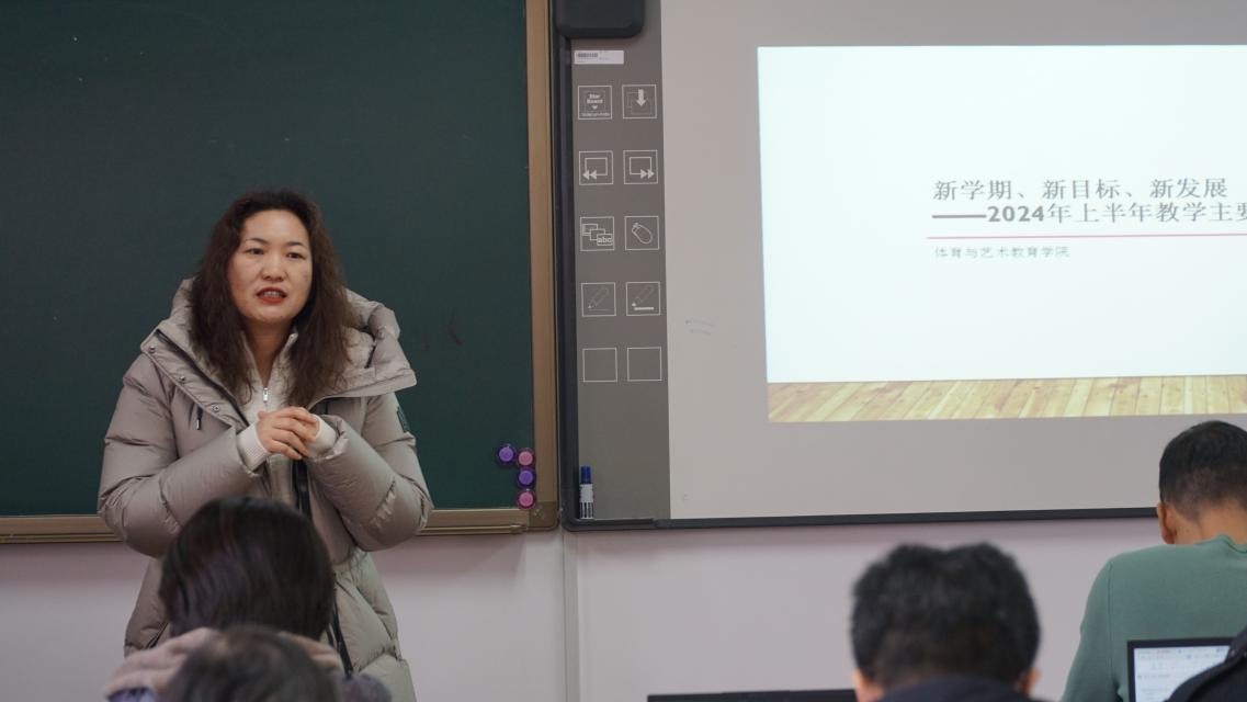 张庆新副院长以时间为序向大家介绍2024年春季学期体艺学院科研与学科建设工作,要求重视并积极参加科研项目、课题申报,加强对内对外宣传工作流程规范与质量管理,并布置固定资产清查工作。