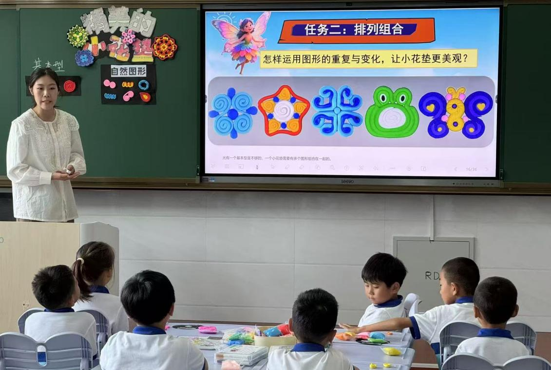 顺义区北务中心小学校赵鹤淇老师带来的一年级《精美的小花垫》同样精彩。赵老师以"小花仙求助信"为情境主线,创设充满童趣的学习氛围。教学中,她循序渐进地引导学生回顾盘泥条技法,探索创意组合造型,学习色彩搭配与图案排列。在小组合作与艺术实践中,孩子们充分发挥想象力,将简单的泥条变成精美的小花垫,在动手实践中体验艺术创作的乐趣与成就感。