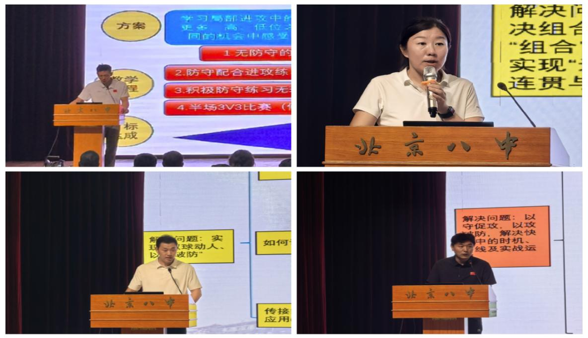 一、课例实践:开展“以赛促学”,突破向实战能力培养转型 活动首个环节呈现四节优质篮球课,覆盖初高中男女差异化教学。石新伟、陈力、赵静、赵志勇四位老师分别以《高二年级(男生)篮球快攻--“三打二”》、《高二年级(男生)无球掩护在实战中的运用》、《初中女生篮球运球+传球组合技术》、《初中男生篮球传接球在技战术中的应用》为主题进行教学展示,并就课程构建思路进行详细的说课。