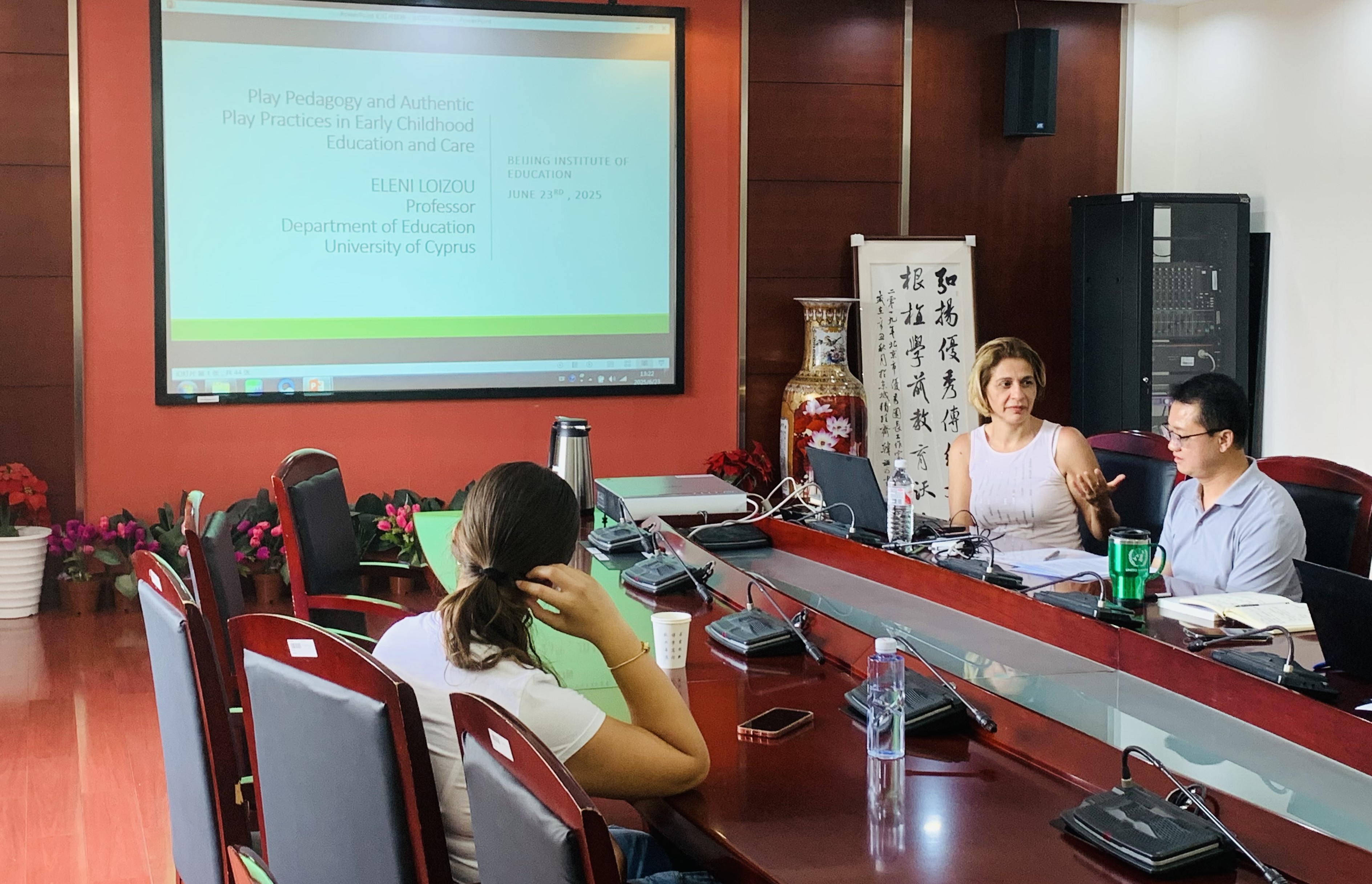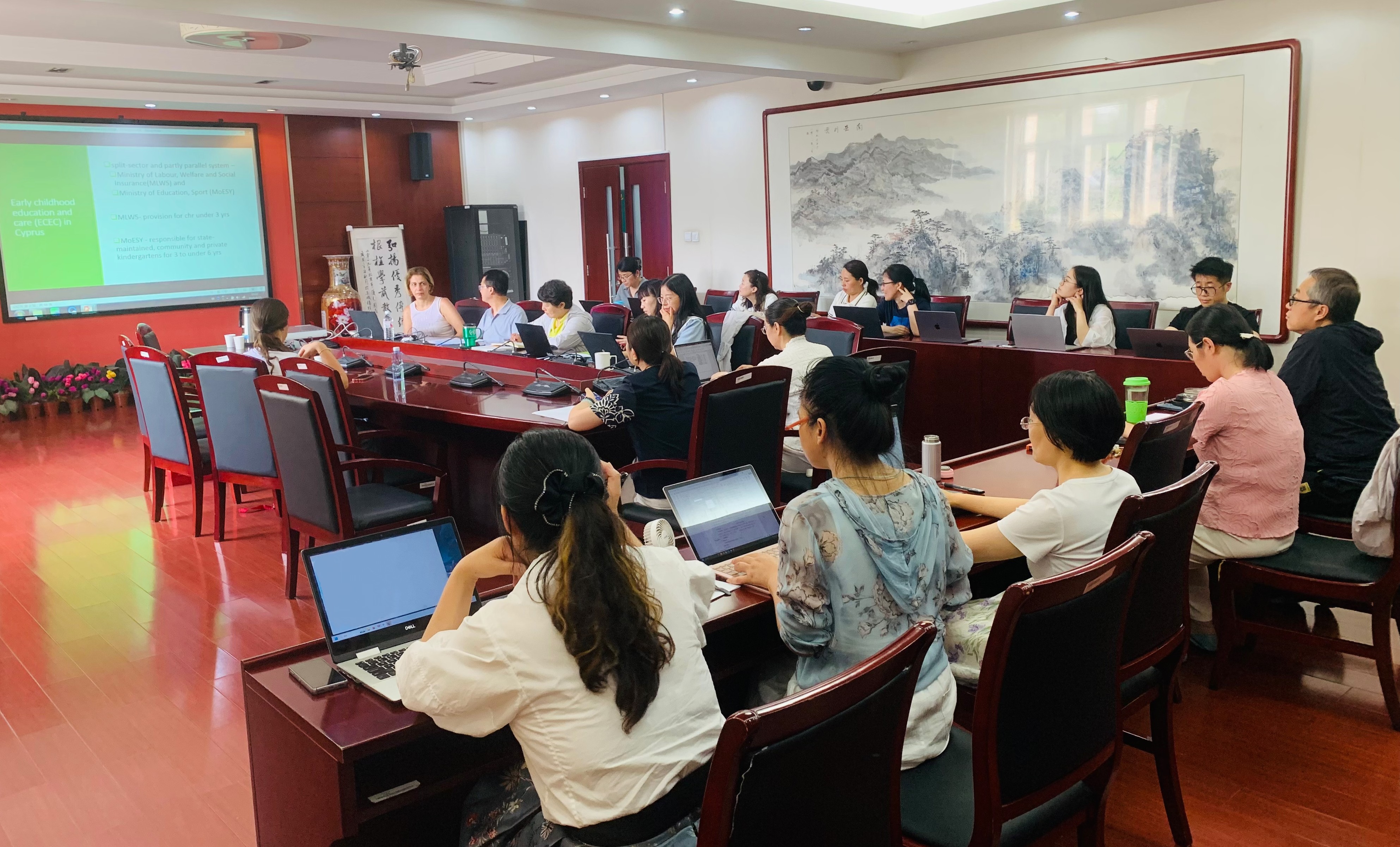 为拓展学院教职工国际视野、深化学前教育国际经验交流,6月23日下午,学前教育学院在黄化门校区举办“中塞学前教育体系与实践”专题交流会。活动邀请塞浦路斯大学教育系学前教育专业教授、幼儿研究实验室主任、塞浦路斯教育和文化部学前教育课程顾问埃莱尼·洛伊索(Eleni Loizou)与学前教育学院全体教师进行了学术交流。交流活动由学前教育学院院长谢志东主持。