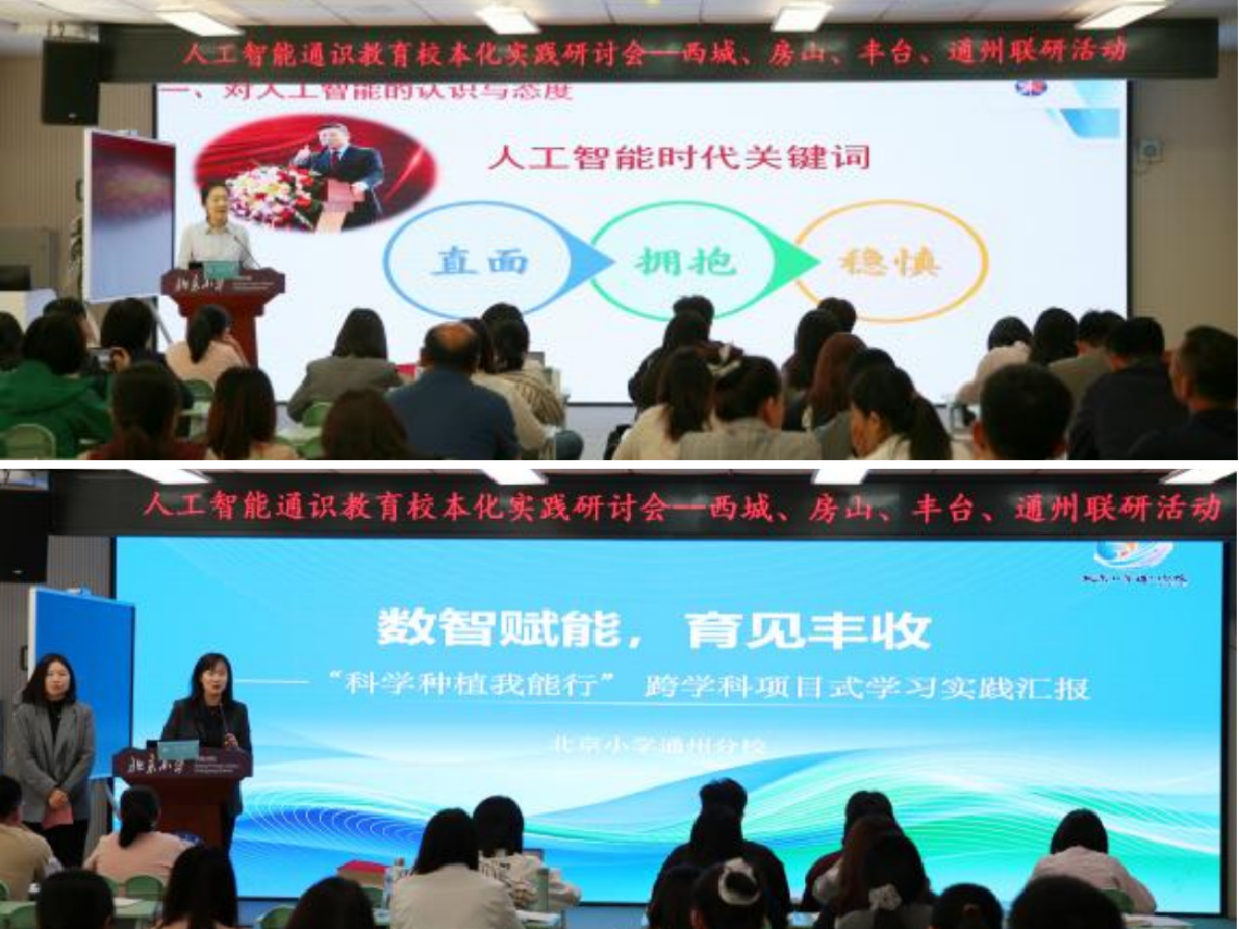 北京小学总校及房山分校、丰台分校、通州分校四所学校的校长及干部、教师代表,分享了各校在人工智能通识教育及人工智能与各学科融合的实践探索与理性思考。