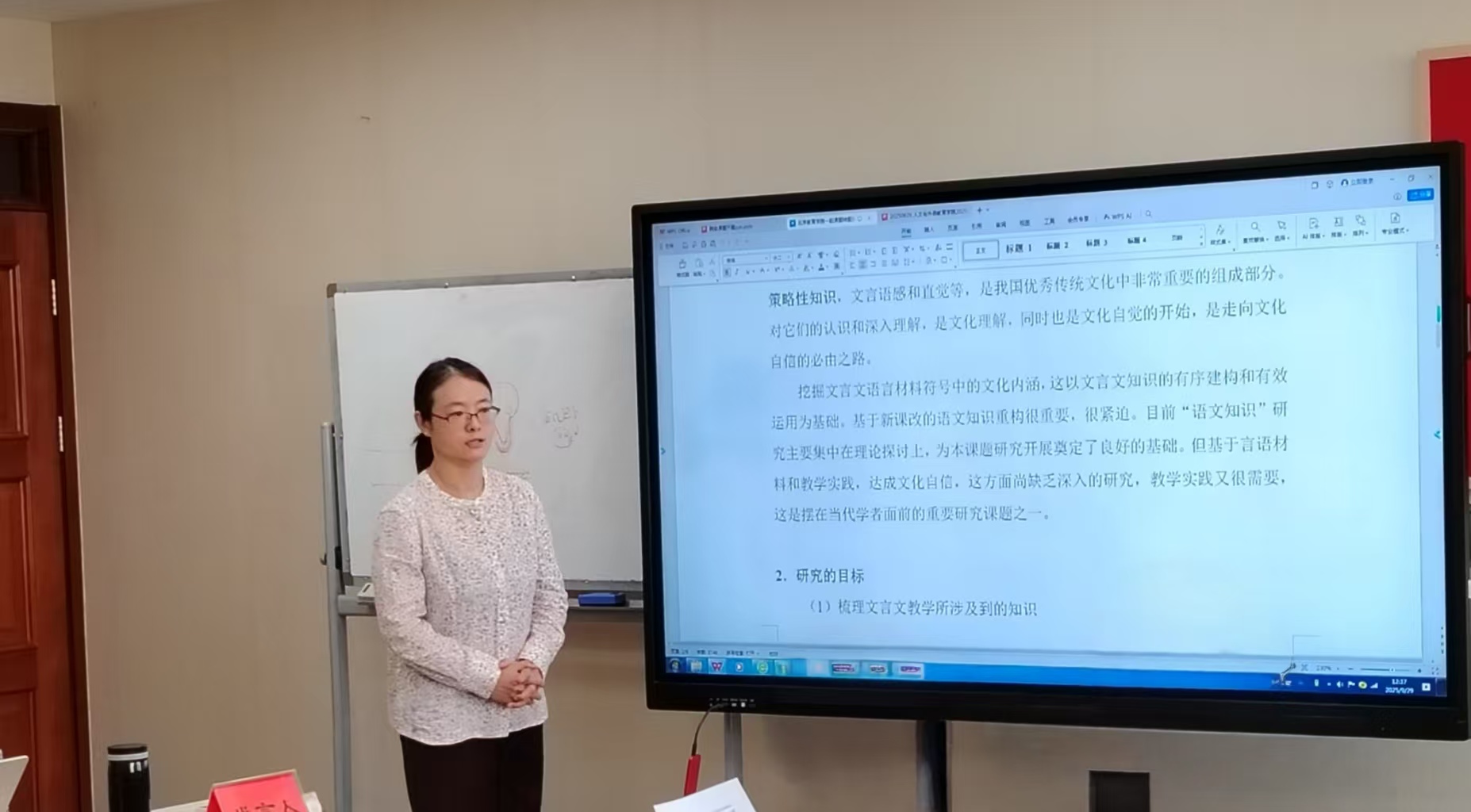 首先进行的是院级课题结题评审,院级一般课题《指向文化自信的文言文知识教学研究》负责人高笑可老师,系统汇报课题研究的完成情况,包括研究任务达成度、核心成果产出、成果应用价值与推广前景,以及研究过程中遇到的问题与解决策略。评审专家结合课题立项申请书与中期报告,对照研究目标逐一核查成果质量,深入评估研究的学术价值与实践意义,对课题在“文言文教学与文化自信培育深度融合”方面的探索给予高度认可。