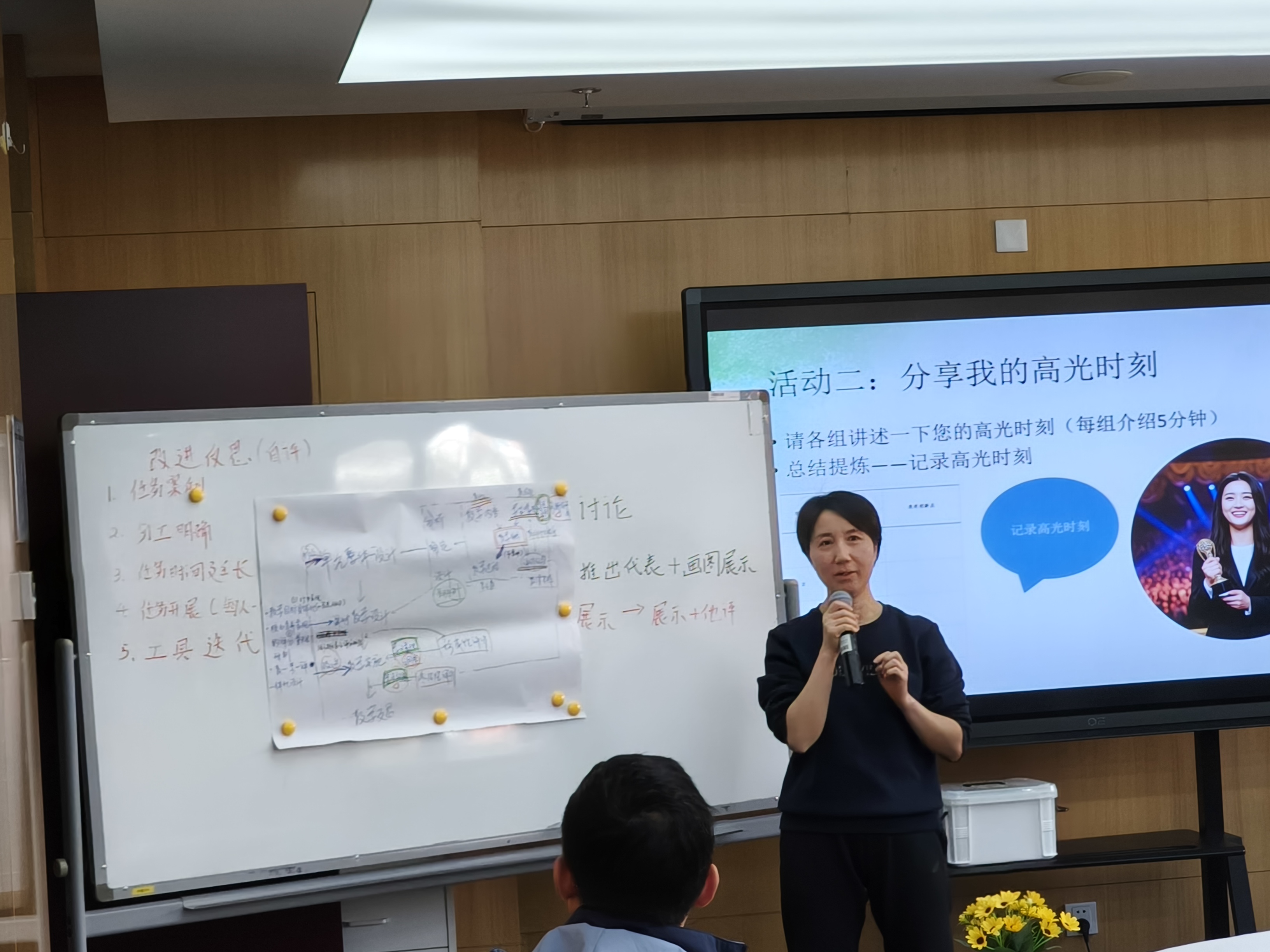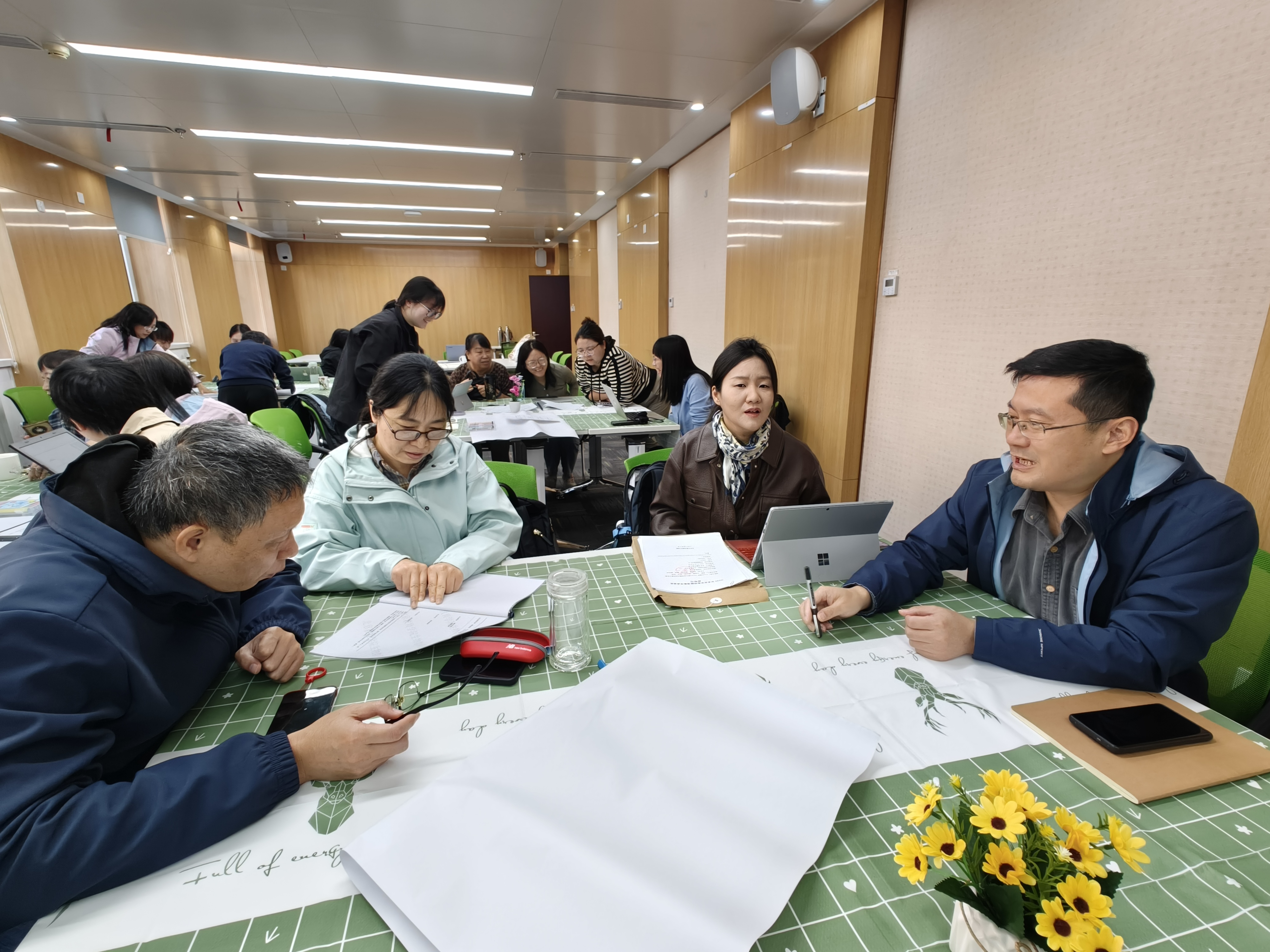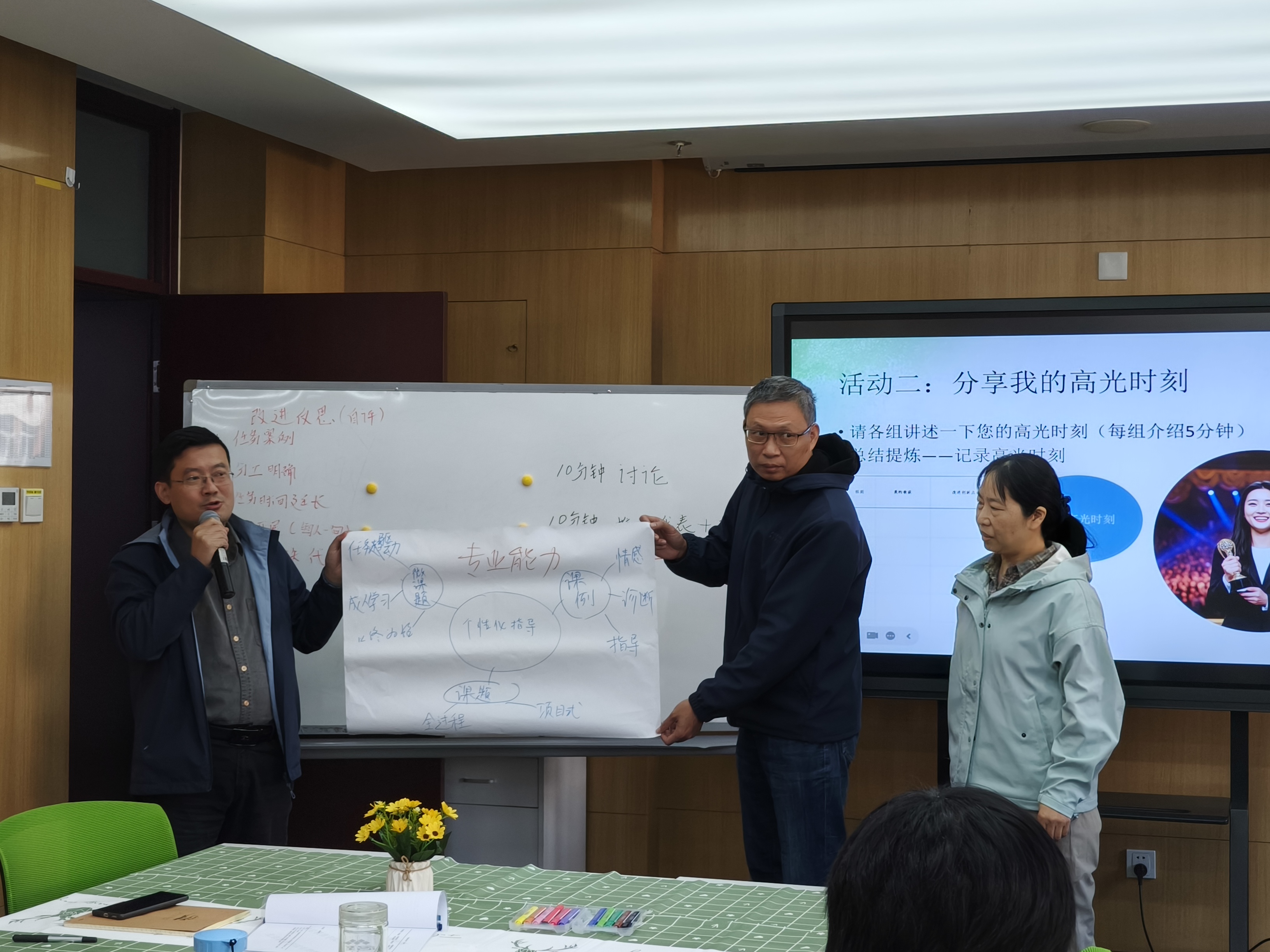 徐扬主任首先展示优青项目方案实施的模型与整体框架,介绍项目以全人教育理念为引领,以课程内容、评价体系为支撑与反馈依据,最终实现提升初中生物教师素质的总目标。随后,参会人员先在组内分享各自培训项目中的高光时刻,经小组讨论后,聚焦专业理念、专业知识、专业能力三大维度展开集体研讨。四组参会代表依次展示研讨成果,内容涵盖个性化指导模式构建、专业素养多维度提升路径、教师内驱力和发展力培育策略,以及单元整体设计与教学实施调整方法等,为项目推进提供多元实践思路。