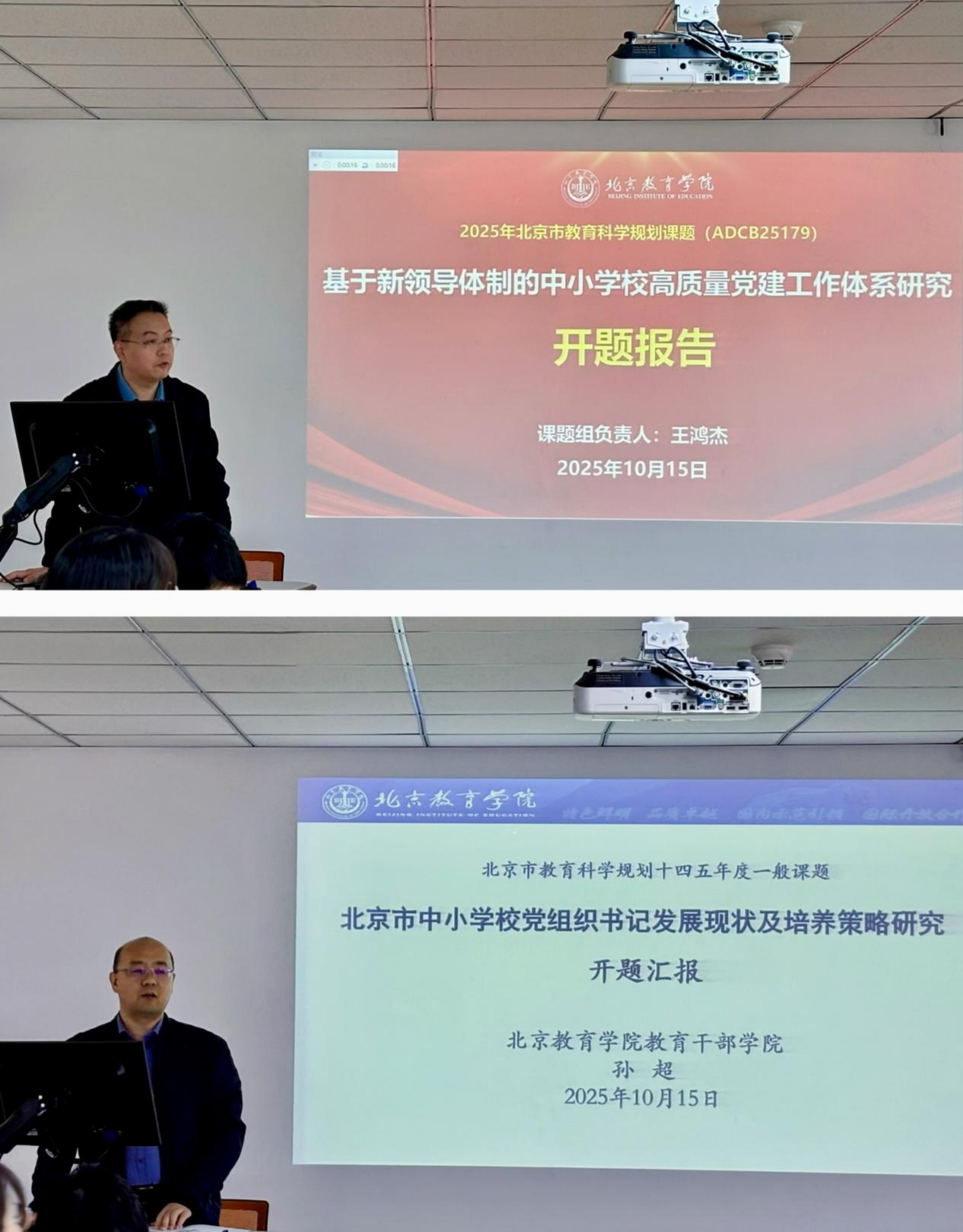 在课题评审环节,两位课题负责人依次进行了开题陈述。王鸿杰书记就2025年北京市教育科学规划一般课题《基于新领导体制的中小学校高质量党建工作体系研究》、孙超主任就2025年北京市教育科学规划一般课题《北京市中小学校党组织书记发展现状及培养策略研究》进行汇报。两位课题负责人从研究背景、文献综述、核心概念界定、研究目标与内容、研究思路与方法、研究团队与进度、预期成果与转化等七方面进行了系统阐述。