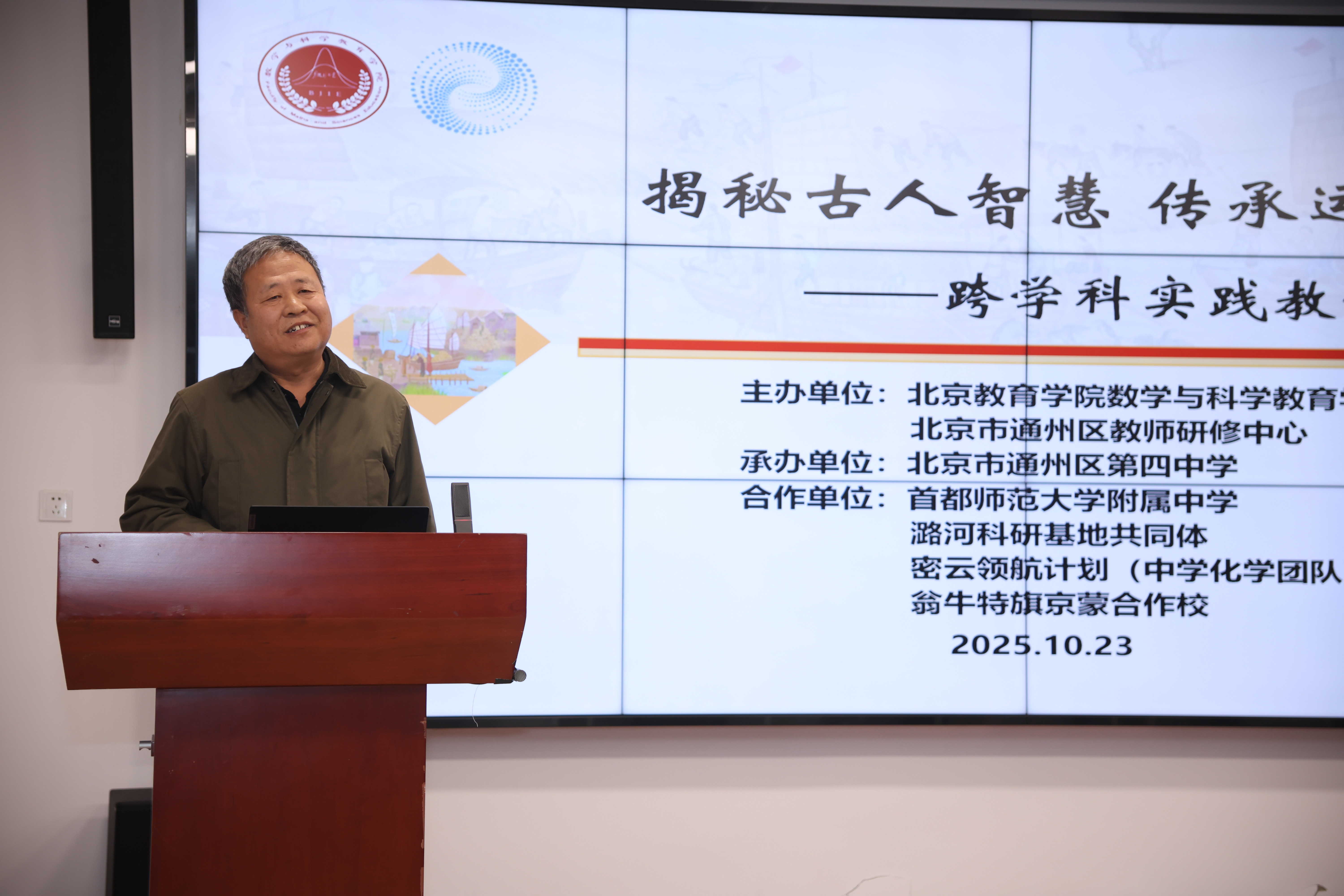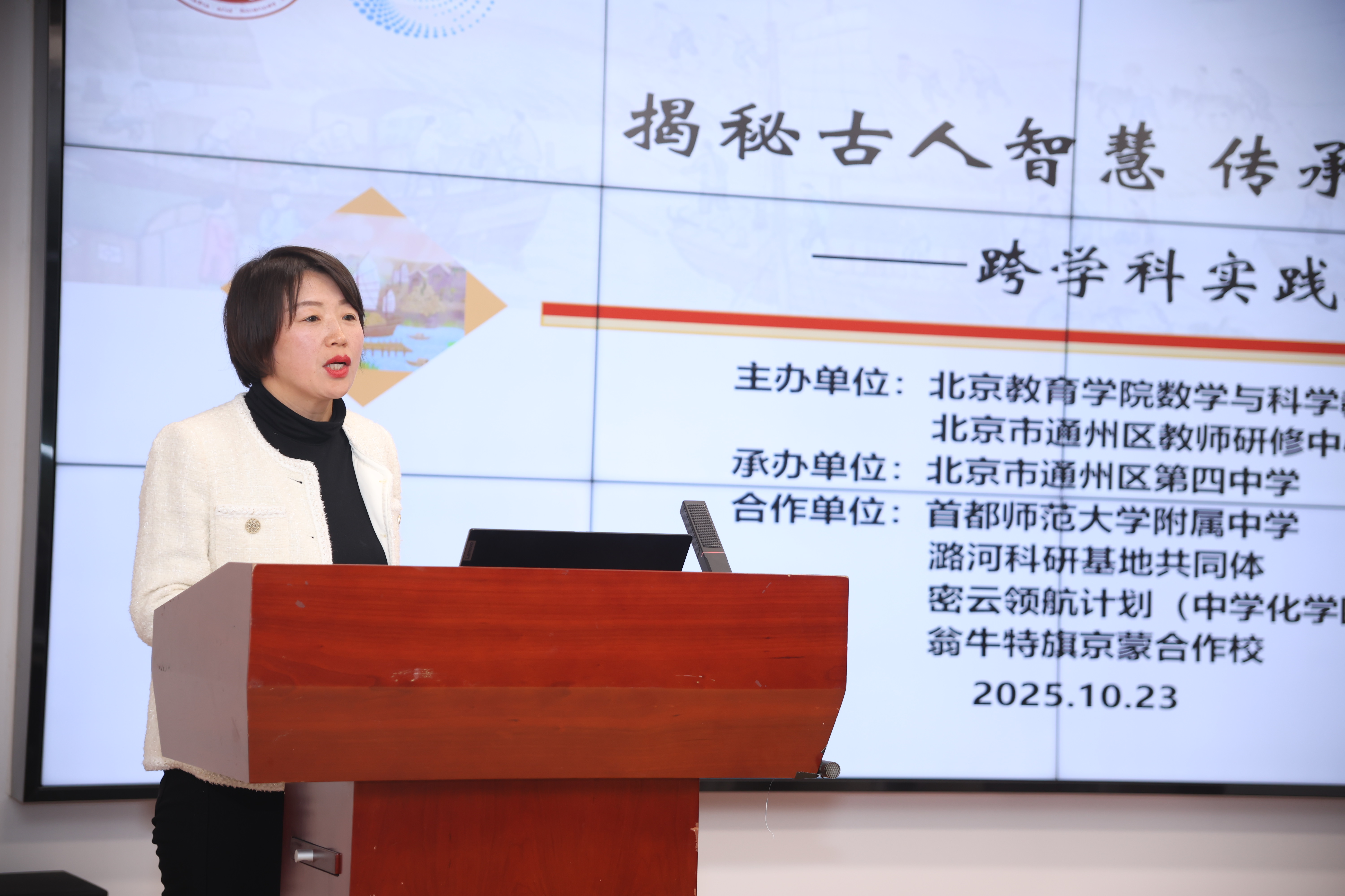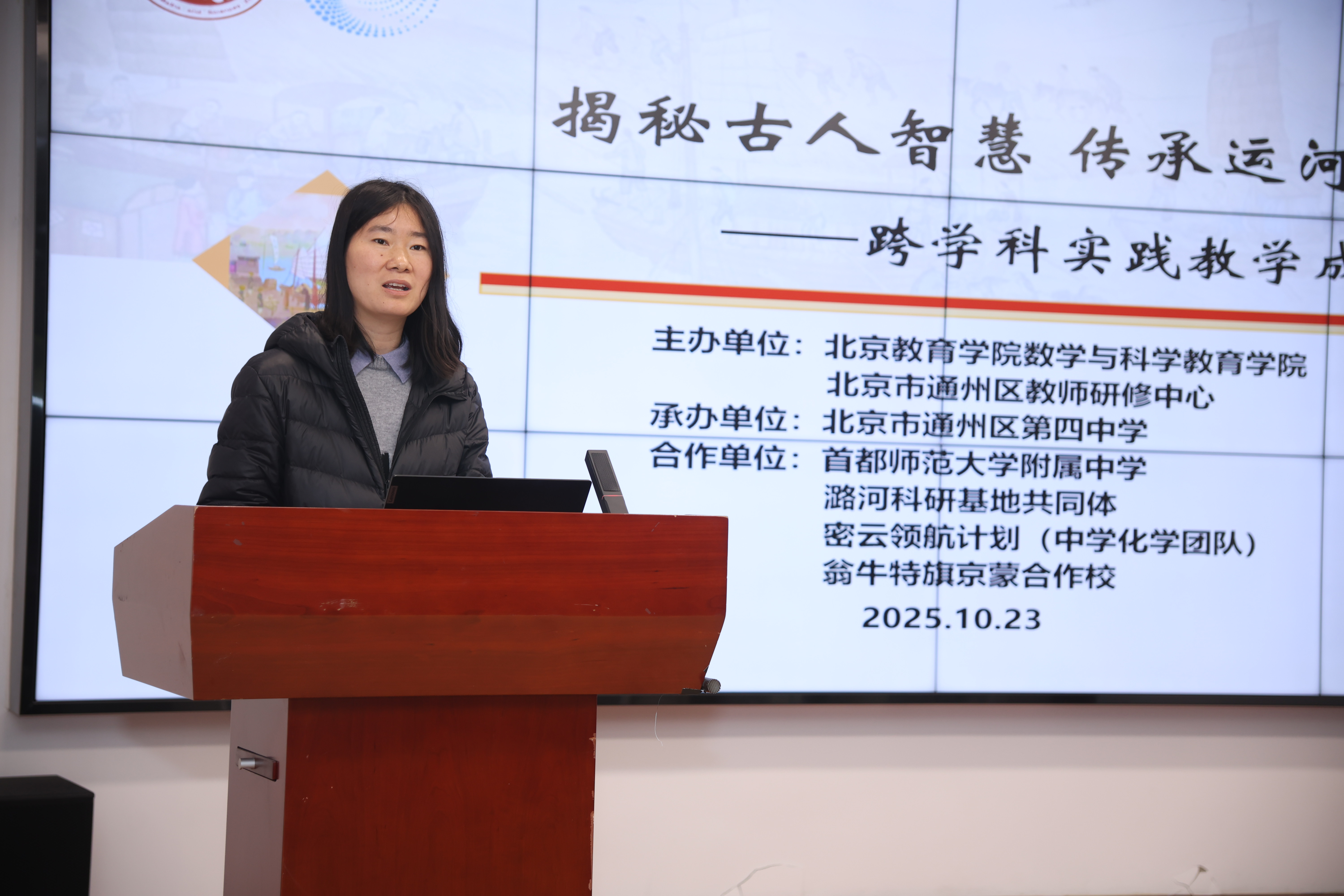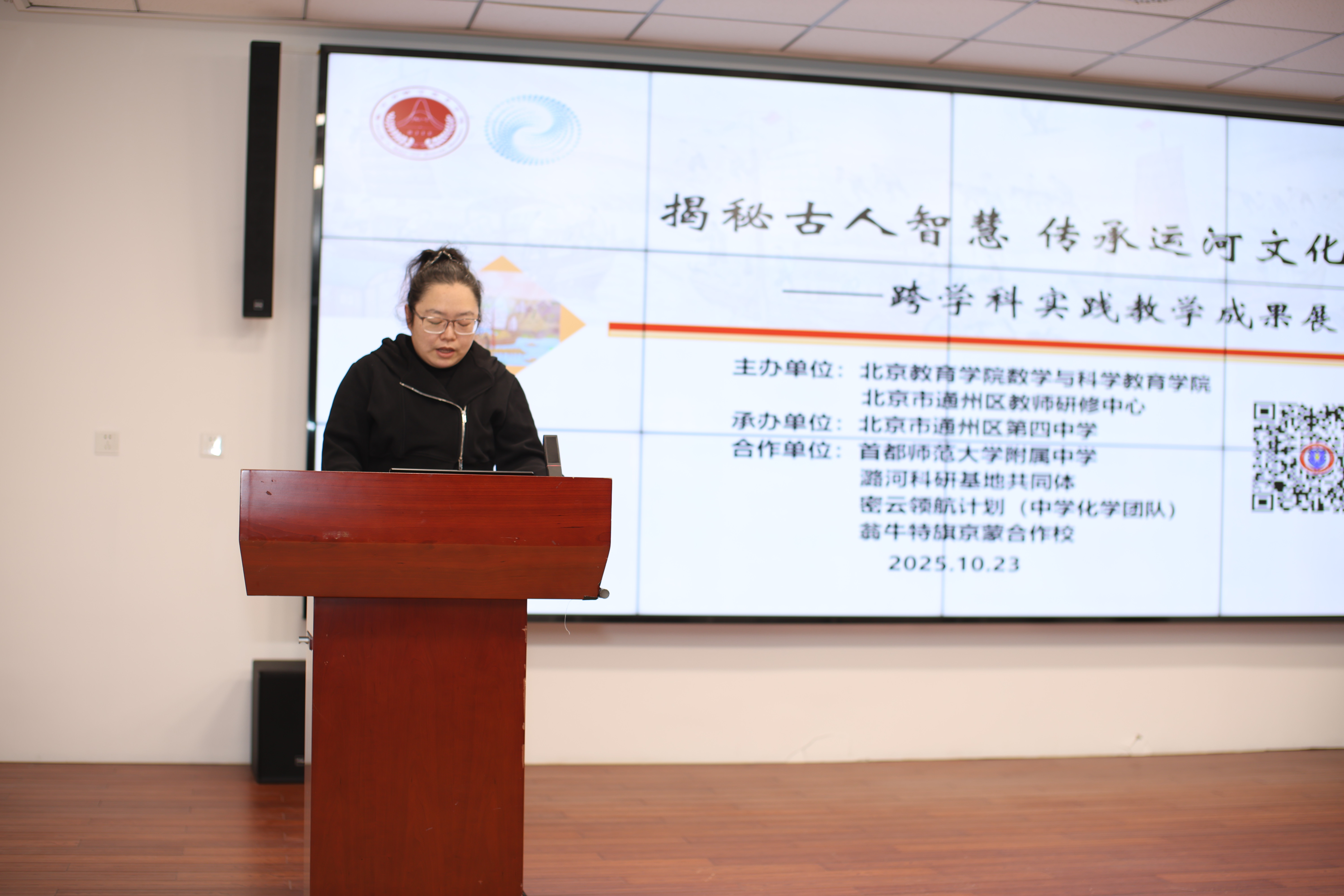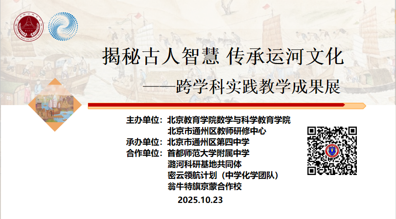 2025年10月23日上午,“揭秘古人智慧 传承运河文化”——大运河文化主题跨学科实践教学成果展示交流会在通州区第四中学顺利举行,此次活动由北京教育学院数学与科学教育学院、通州区教师研修中心主办,通州区第四中学承办。数学与科学教育学院党总支书记王钦忠、通州分院副院长李凯、通州四中总支书记张士东、密云三中张歌校长出席会议,我院曾早早、徐扬、陈鹏举、丁友福和通州分院相关学科教研员等作为点评专家参加了本次会议,密云领航计划(中学化学团队)、内蒙古中小学名师培养计划等项目学员等参加学习和交流。活动采用线上线下相结合的方式,面向全市直播,引发广泛关注。